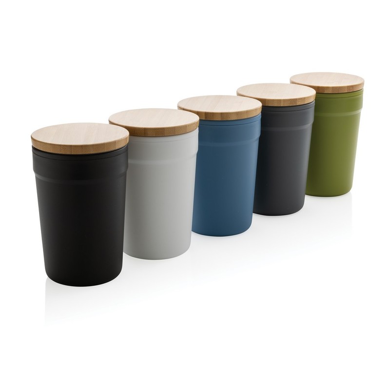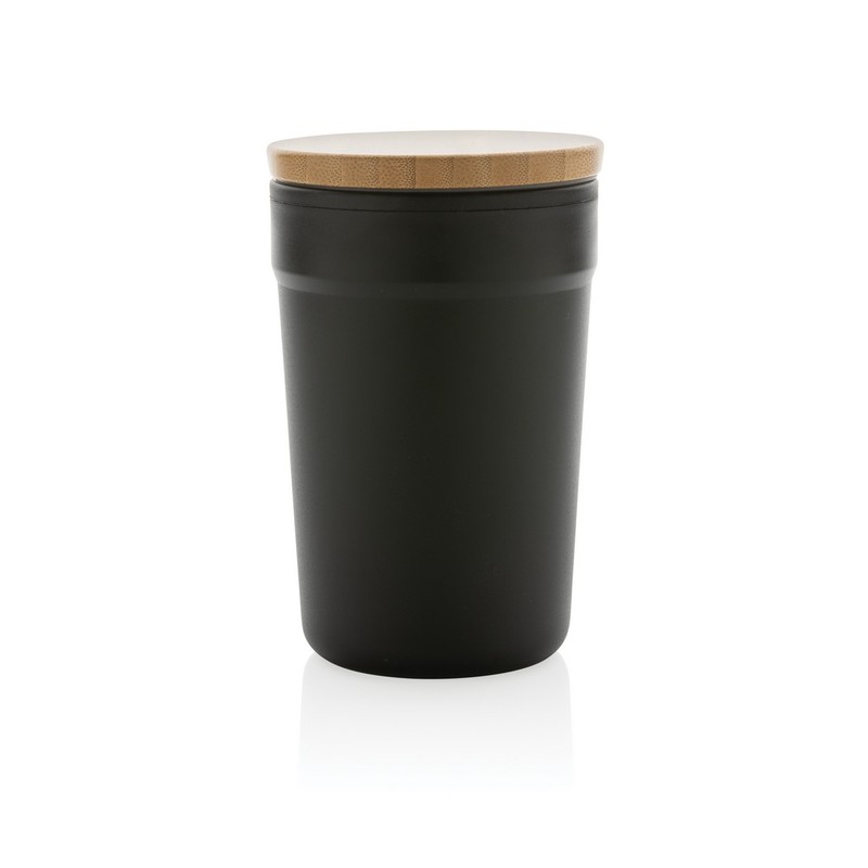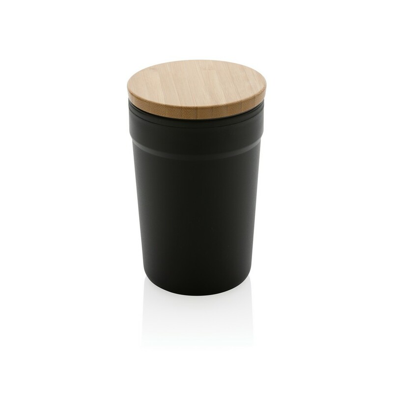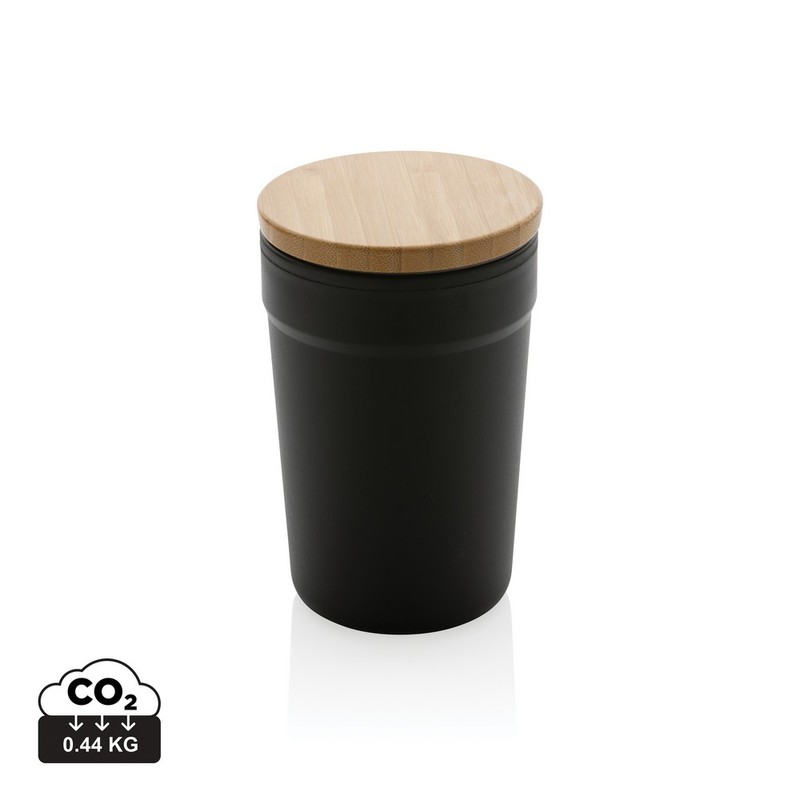 Kubek podróżny 300 ml, bambusowe wieczko, wykonany z PP z recyklingu z certyfikatem GRS, całkowita zawartość materiałów z recyklingu obliczona na podstawie wagi całkowitej przedmiotu: 52%, w ozdobnym pudełku z papieru kraftowego z certyfikatem FSC®, ślad węglowy produktu: 0,39 kg CO2