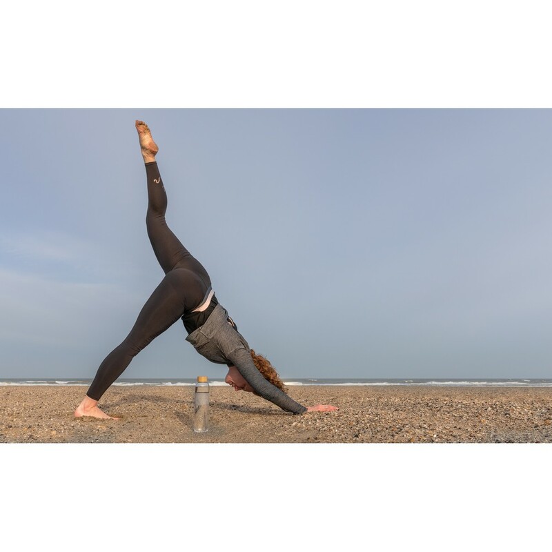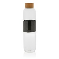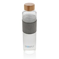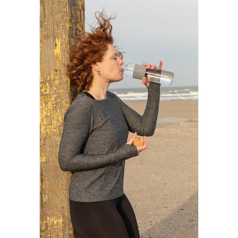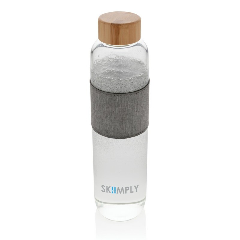 Szklana butelka 750 ml w pokrowcu z RPET, wykonana z wysokiej jakości szkła borokrzemowego odpornego na zmiany temperatury, szczelna zakrętka z bambusa, 2% zysku ze sprzedaży każdego produktu jest przekazywane do fundacji Water.org