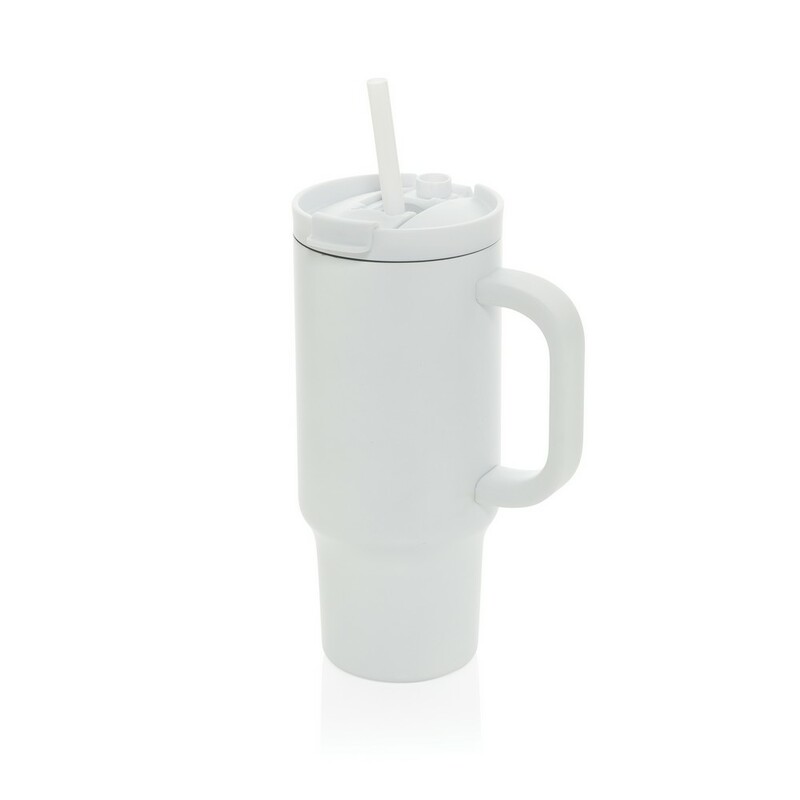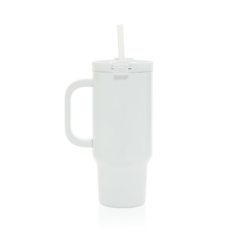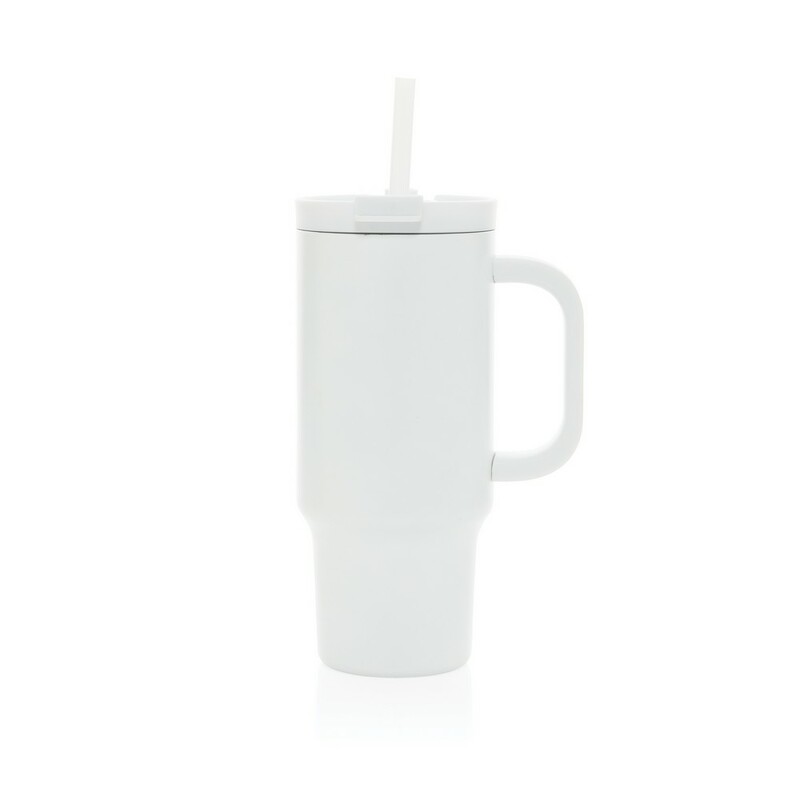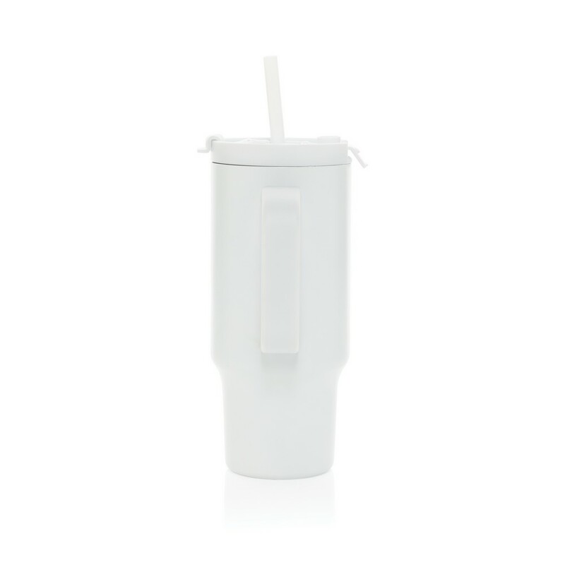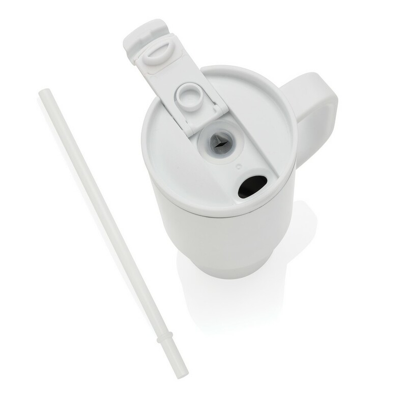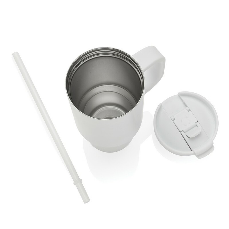 Kubek termiczny 480 ml, podwójne ścianki z próżnią pomiędzy dzięki czemu kubek posiada funkcję termosu, posiada słomkę i szeroki otwór do picia, wykonany z materiałów z recyklingu, całkowita zawartość materiałów z recyklingu obliczona na podstawie wagi całkowitej produktu: 73%