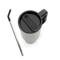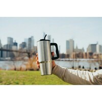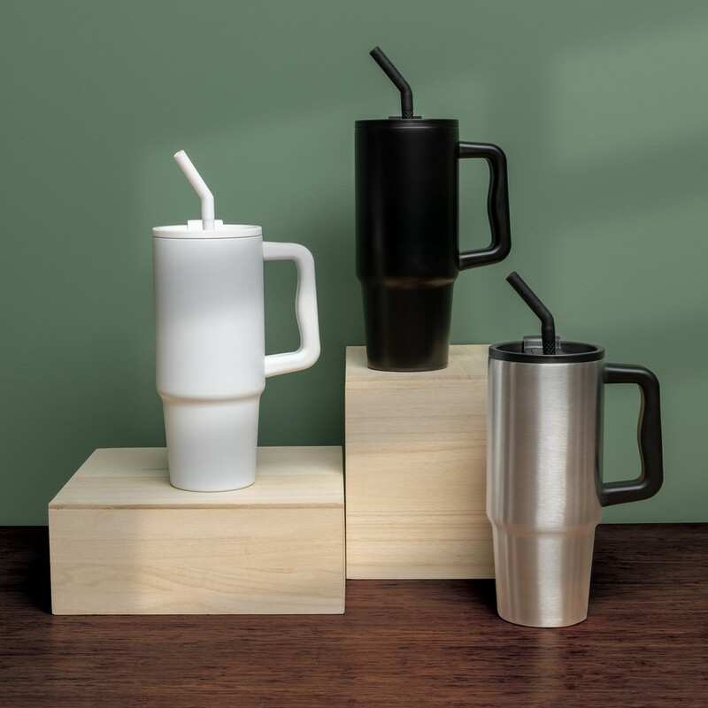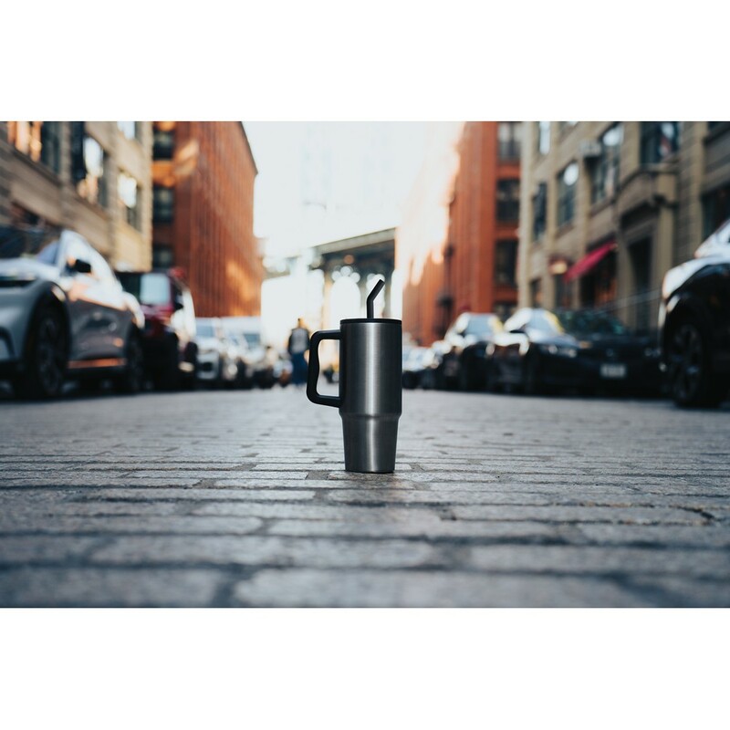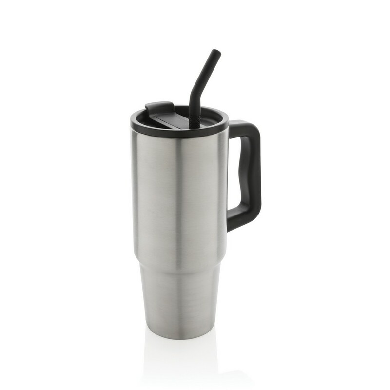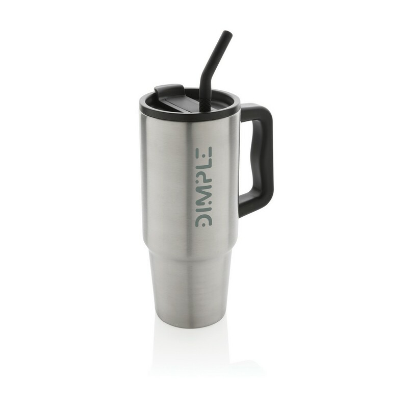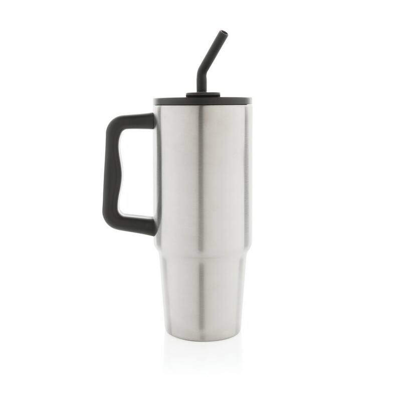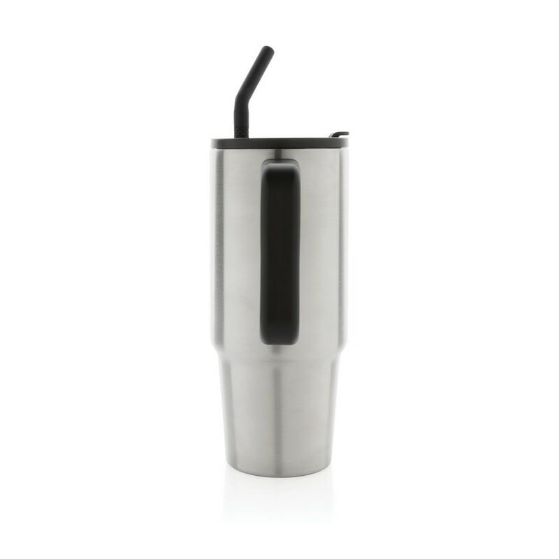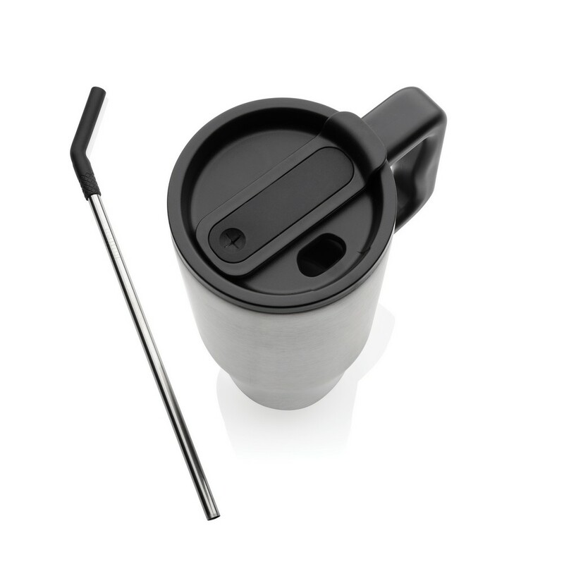 Kubek termiczny 900 ml, wykonany ze stali nierdzewnej z recyklingu, podwójne ścianki ze stali nierdzewnej z próżnią pomiędzy, zakręcane wieczko z dziubkiem i słomką, zalecane mycie ręczne, ślad węglowy produktu: 0 kg CO2