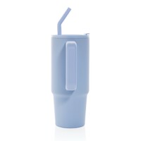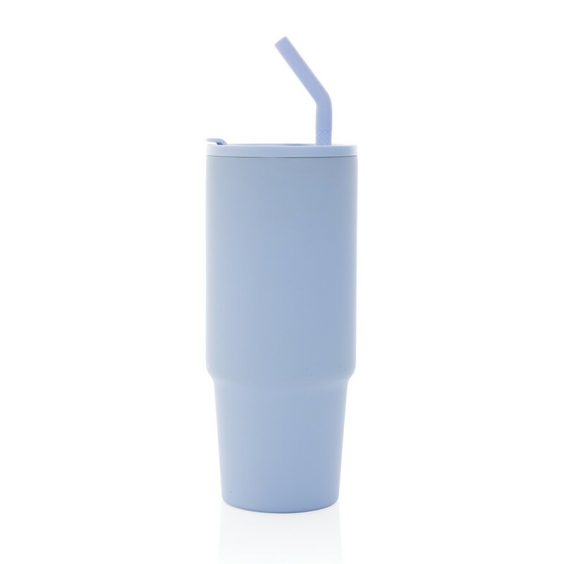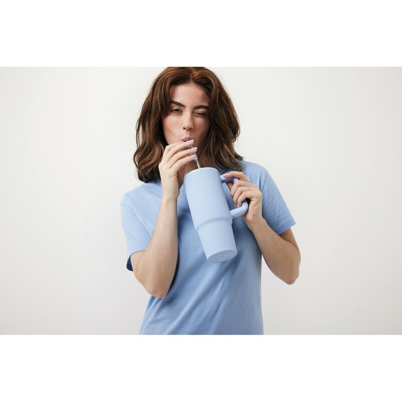 Kubek termiczny 900 ml, wykonany ze stali nierdzewnej z recyklingu, podwójne ścianki ze stali nierdzewnej z próżnią pomiędzy, zakręcane wieczko z dziubkiem i słomką, zalecane mycie ręczne, ślad węglowy produktu: 0 kg CO2