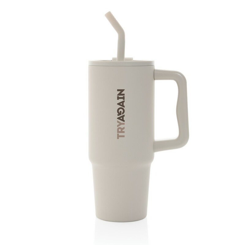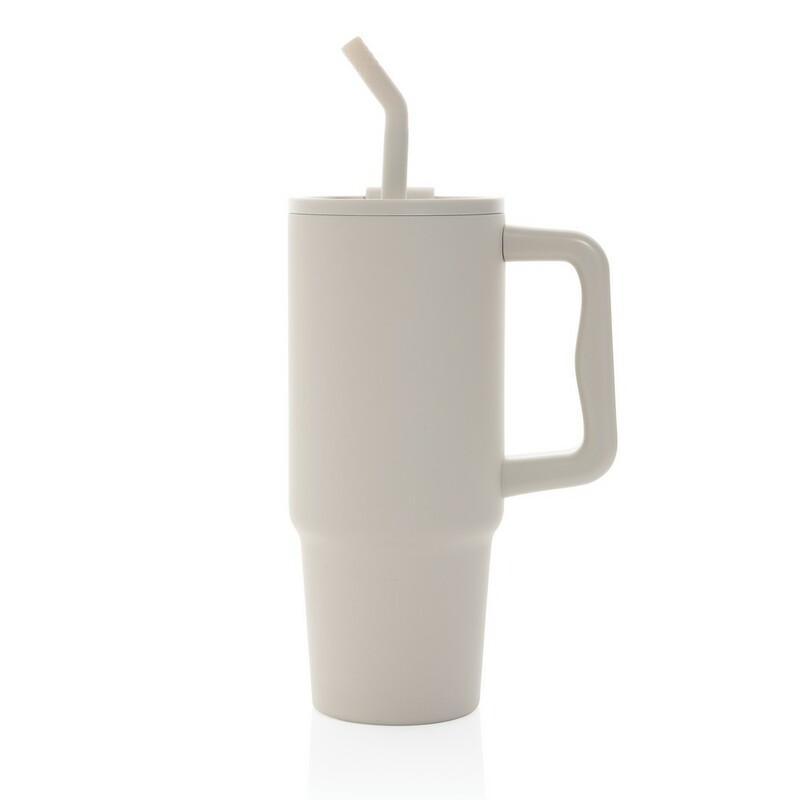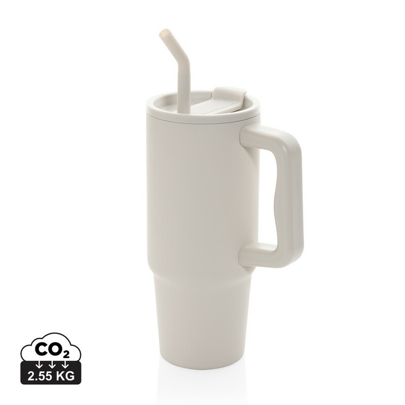 Kubek termiczny 900 ml, wykonany ze stali nierdzewnej z recyklingu, podwójne ścianki ze stali nierdzewnej z próżnią pomiędzy, zakręcane wieczko z dziubkiem i słomką, zalecane mycie ręczne, ślad węglowy produktu: 0 kg CO2