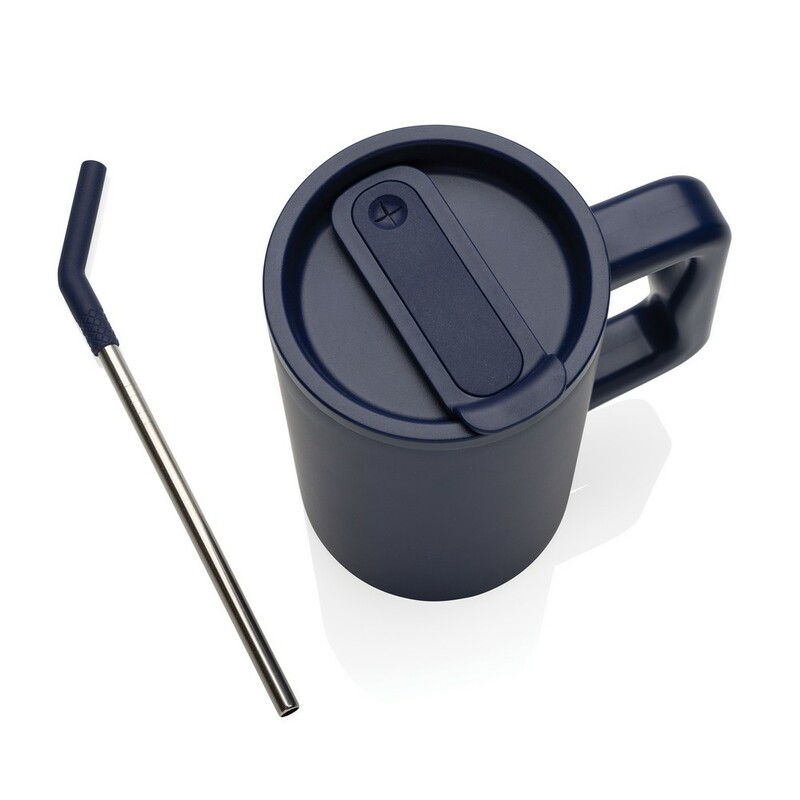 Kubek termiczny 800 ml, posiada słomkę z silikonową nakładką, zakręcane wieczko, wykonany ze stali nierdzewnej z recyklingu, podwójne ścianki ze stali nierdzewnej z próżnią między ściankami, dzięki czemu zachowuje funkcje termosu i długo utrzymuje temperaturę nie oddając jej na zewnątrz, zalecane mycie ręczne