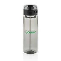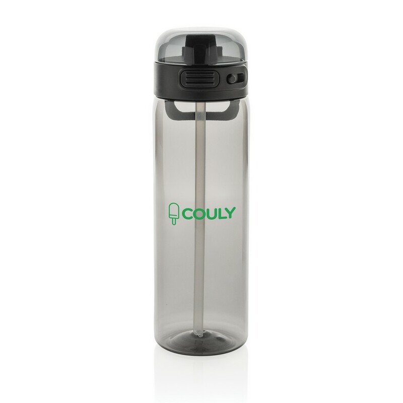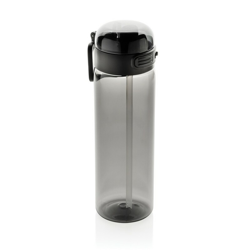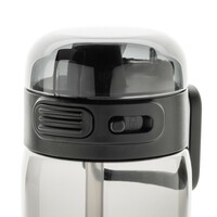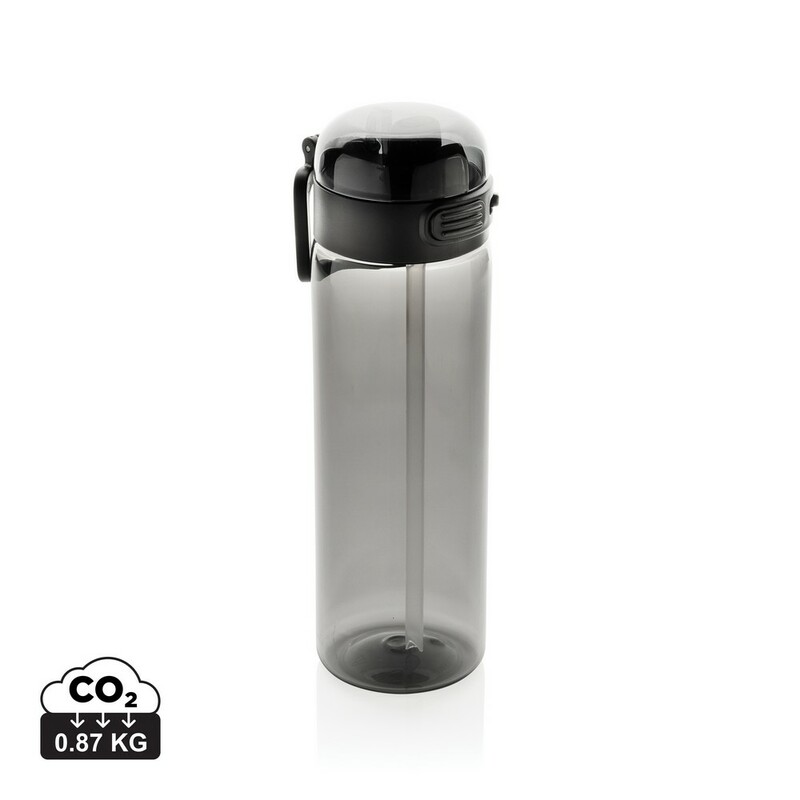 Butelka sportowa 800 ml, wieczko z blokadą i przyciskiem otwarcia ustnika umożliwiającym obsługę jedną ręką, wykonana z RPET, całkowita zawartość materiałów z recyklingu obliczona na podstawie wagi całkowitej przedmiotu: 84%