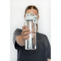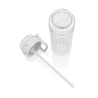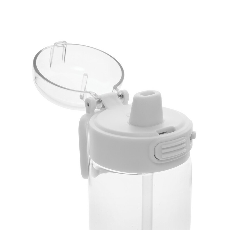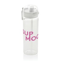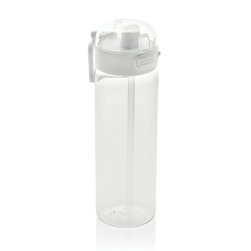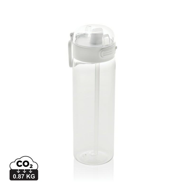 Butelka sportowa 800 ml, wieczko z blokadą i przyciskiem otwarcia ustnika umożliwiającym obsługę jedną ręką, wykonana z RPET, całkowita zawartość materiałów z recyklingu obliczona na podstawie wagi całkowitej przedmiotu: 84%