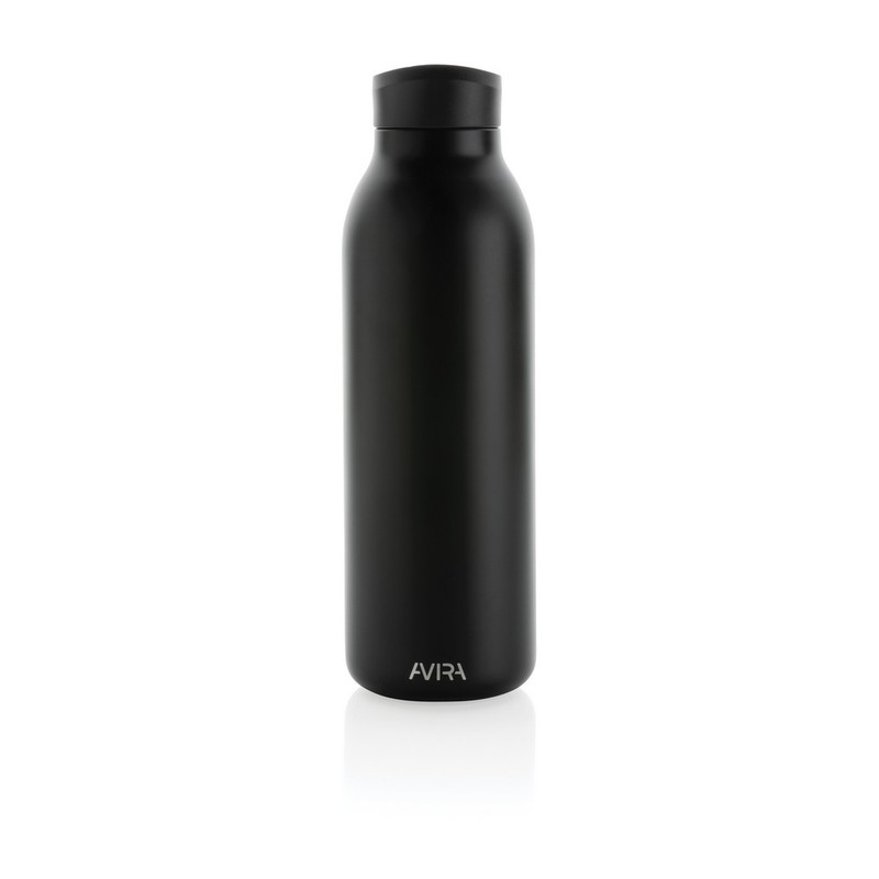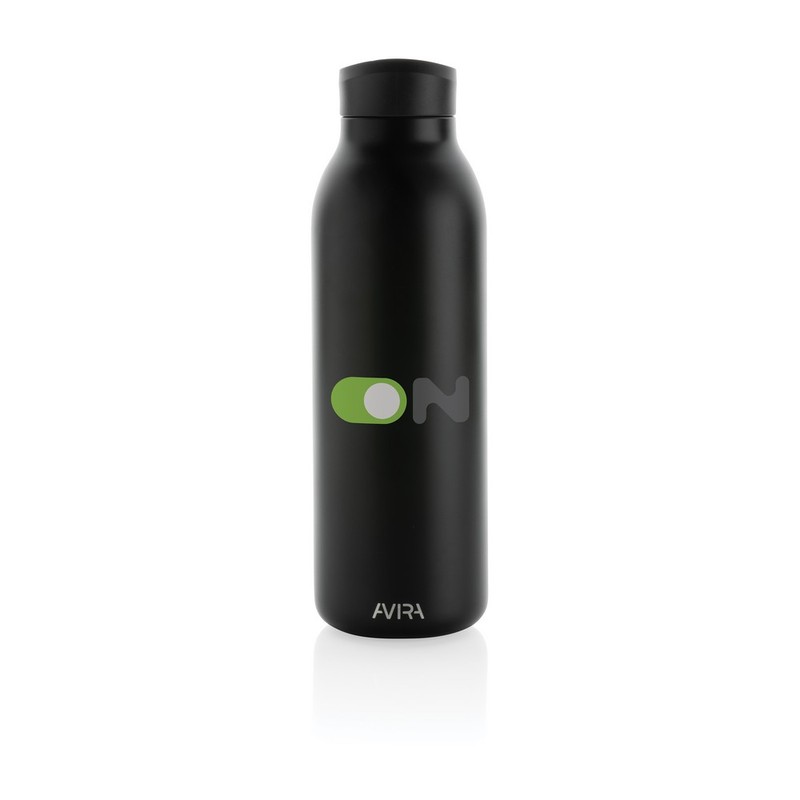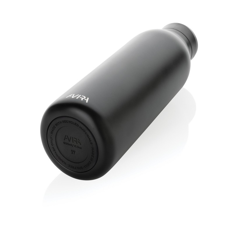 Butelka termiczna 500 ml, podwójne ścianki ze stali nierdzewnej z recyklingu z próżnią pomiędzy, zawartość materiałów z recyklingu obliczona na podstawie wagi całkowitej przedmiotu: 97%, utrzymuje temperaturę napojów ciepłych do 10 godzin oraz zimnych do 20 godzin, pasuje do większości uchwytów samochodowych, w pudełku z certyfikatem FSC®, klasa termiczna: A, ślad węglowy produktu: 1,35 kg CO2