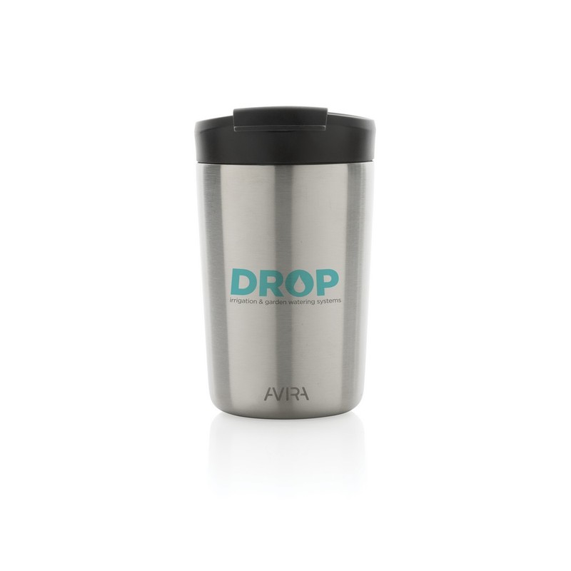 Kubek termiczny 300 ml, podwójne ścianki ze stali nierdzewnej z próżnią pomiędzy, wykonany ze stali nierdzewnej z recyklingu z certyfikatem RCS, całkowita zawartość materiałów z recyklingu obliczona na podstawie wagi całkowitej przedmiotu: 71%, w pudełku z papieru kraftowego z certyfikatem FSC®, pudełko można wykorzystać jako stojak na telefon lub doniczkę