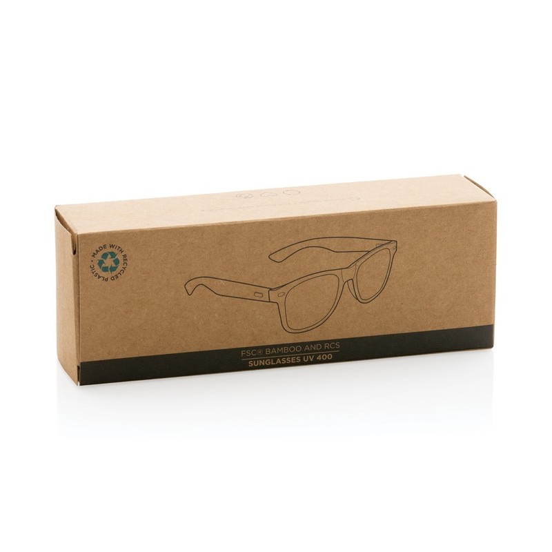 Okulary przeciwsłoneczne z filtrem UV400, wykonane z PC z recyklingu, zauszniki wykonane w 100% z bambusa z certyfikatem FSC®, pudełko z kraftowego papieru w komplecie, ślad węglowy produktu: 0,07 kg CO2