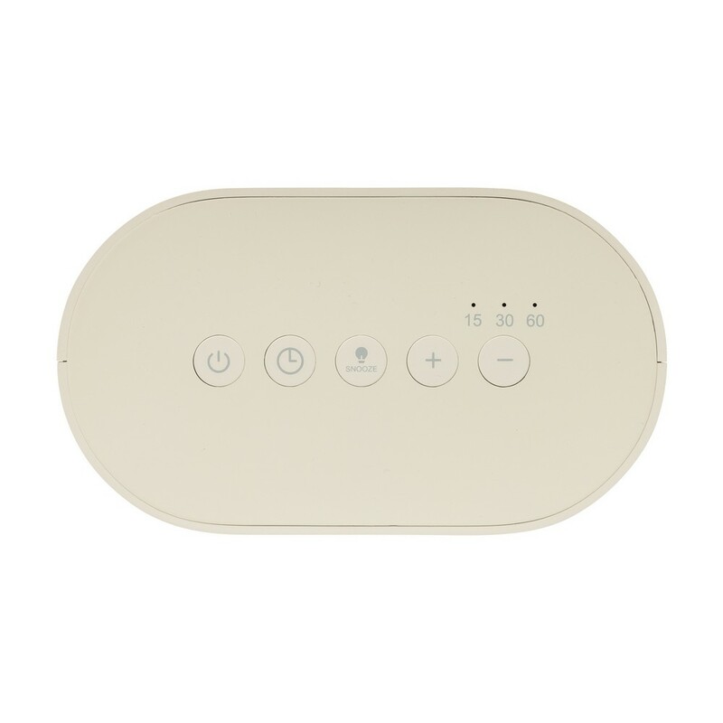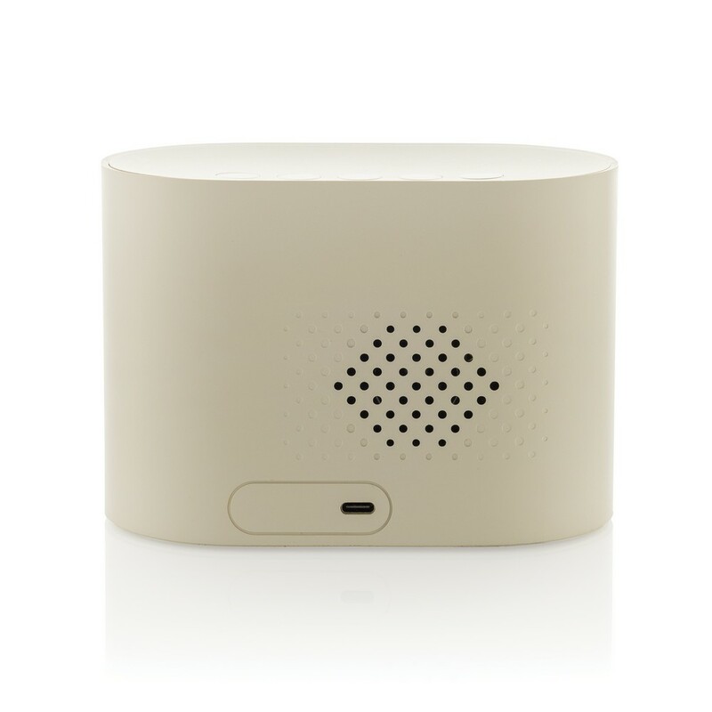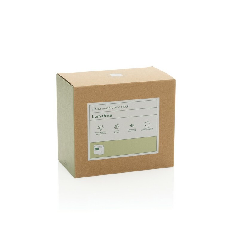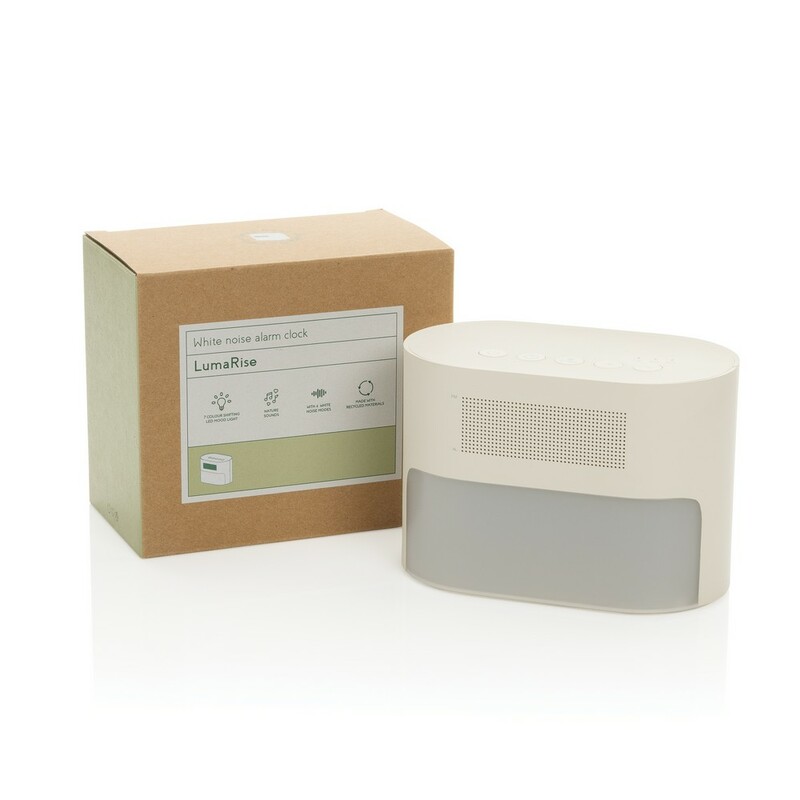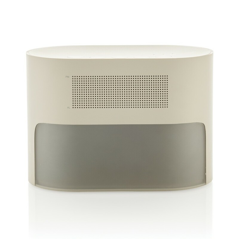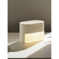 Zegar na biurko, budzik z funkcją białego szumu, posiada 6 wbudowanych uspokajających dźwięków ułatwiających zasypianie, posiada zintegrowane podświetlenie imitujące wschód słońca łagodnie wybudzające ze snu, kabel USB-C 120 cm w komplecie, wykonany z materiałów z recyklingu z certyfikatem RCS, całkowita zawartość materiałów z recyklingu obliczona na podstawie wagi całkowitej przedmiotu: 58%