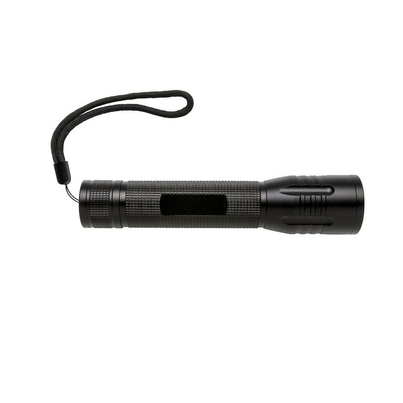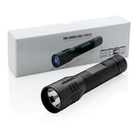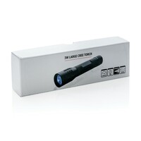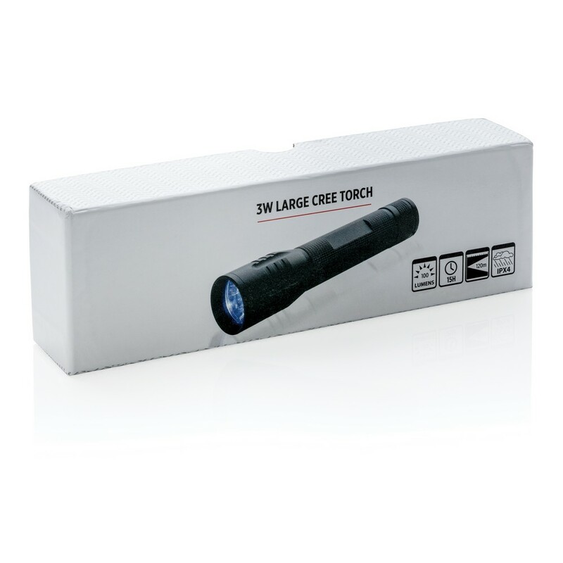 Latarka CREE 3W o bardzo jasnym świetle, wykonana z trwałego aluminium, 100 lumenów, czas pracy do 15 godzin, dzięki zastosowaniu diod CREE światło jest jaśniejsze niż w przypadku diod LED, ślad węglowy produktu: 2,82 kg CO2