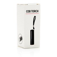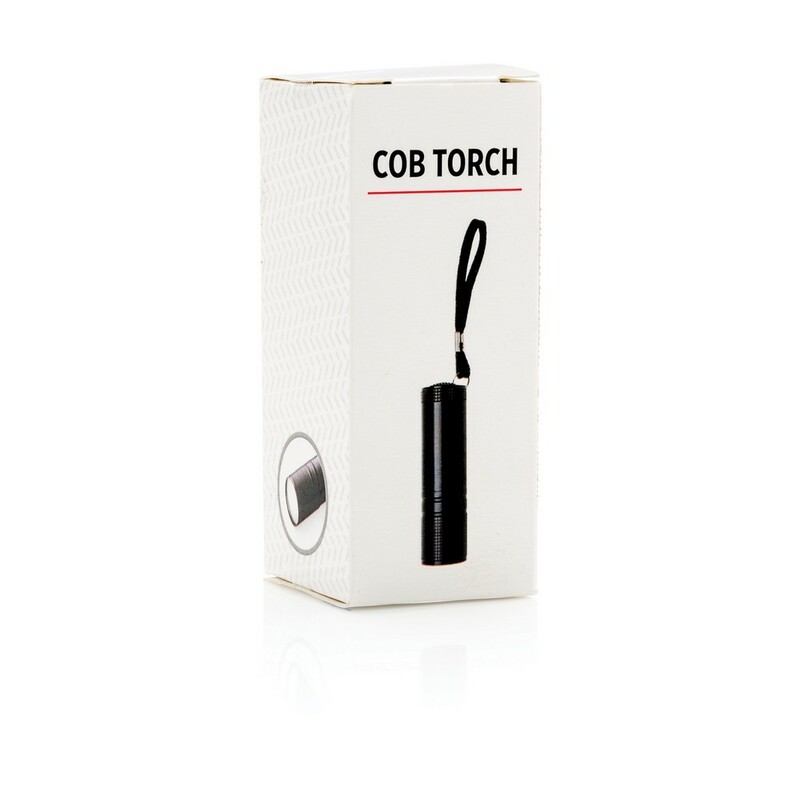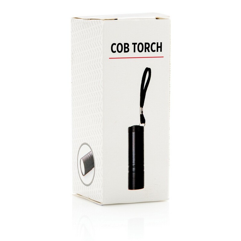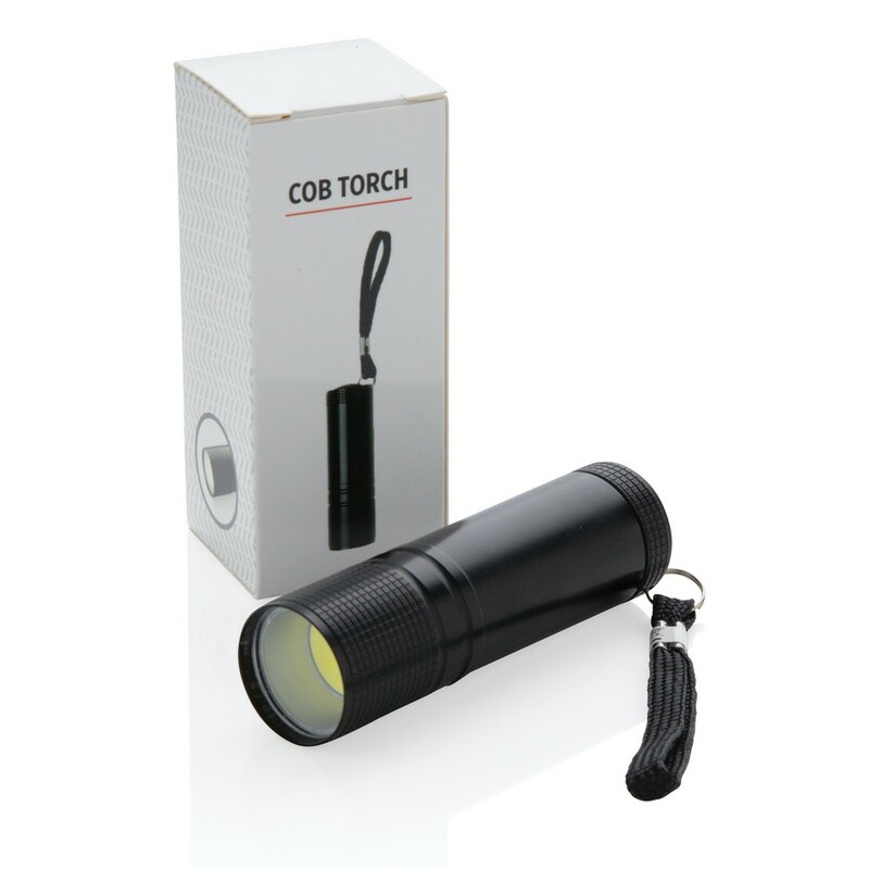 Latarka kieszonkowa COB, bardzo jasne światło, jaśniejsze od standardowych latarek LED, zużywa mniej energii, dzięki czemu może być używana do 30% dłużej na tej samej baterii, obudowa z wytrzymałego aluminium, pasek na rękę, 3 baterie AAA w komplecie, ślad węglowy produktu: 0,58 kg CO2