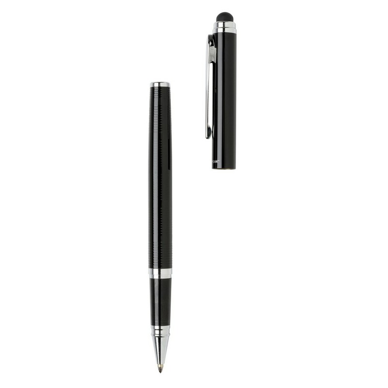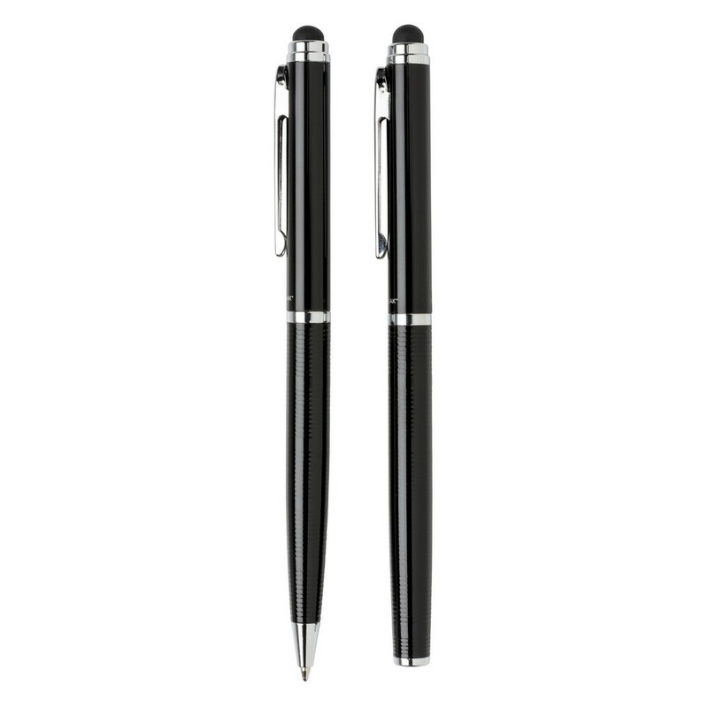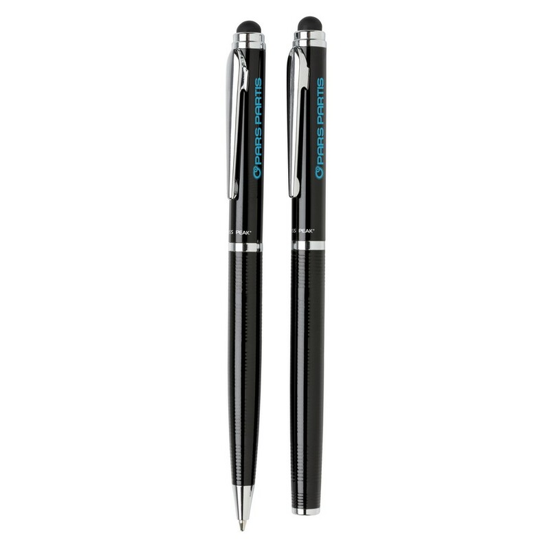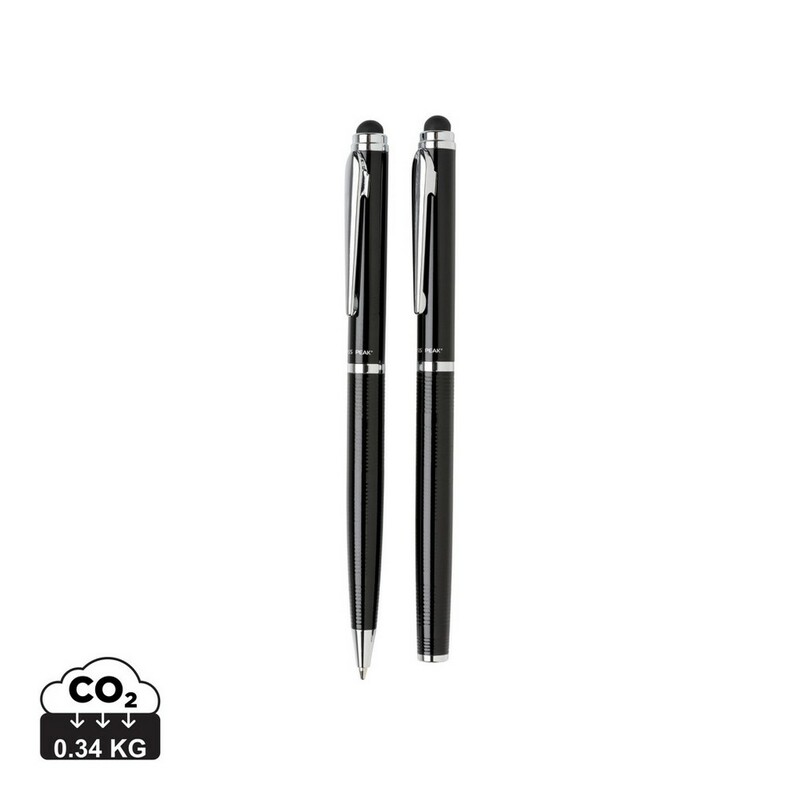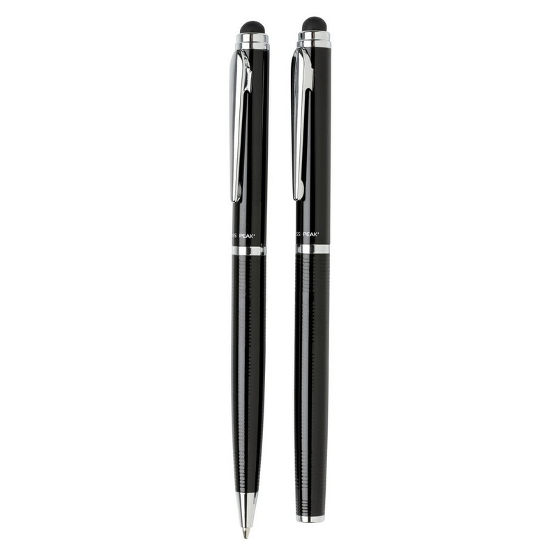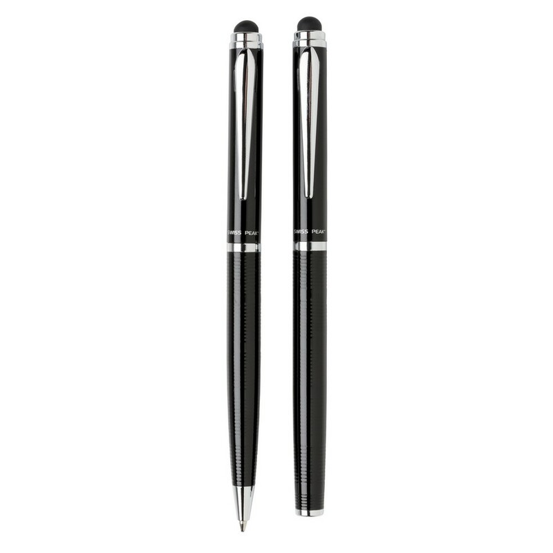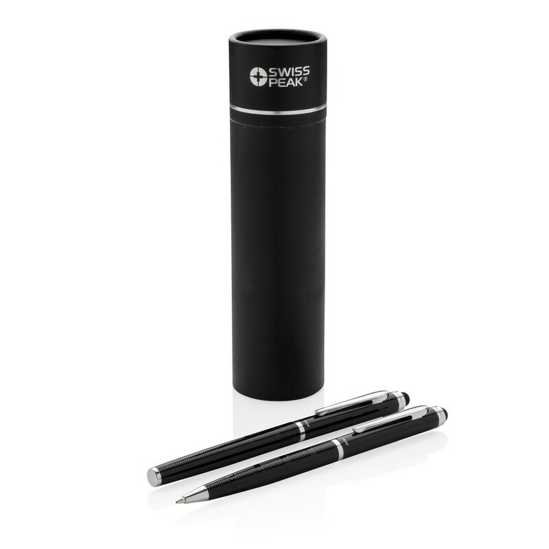 Zestaw piśmienniczy, pióro kulkowe i długopis wysokiej jakości, oba produkty z końcówką touch pen, miejsce pod nadruk, w ozdobnym pudełku Swiss Peak, grawer ukazuje powierzchnię w kolorze złotym, ślad węglowy produktu: 0,34 kg CO2