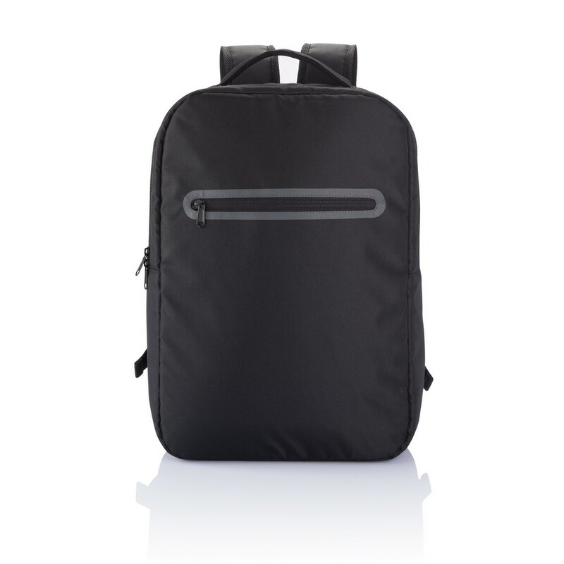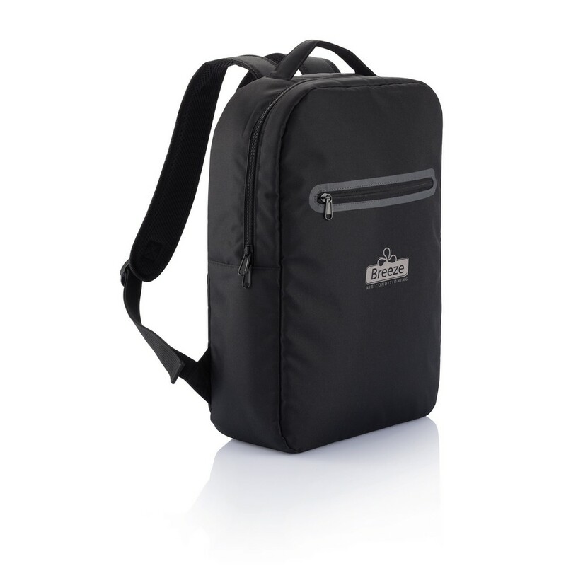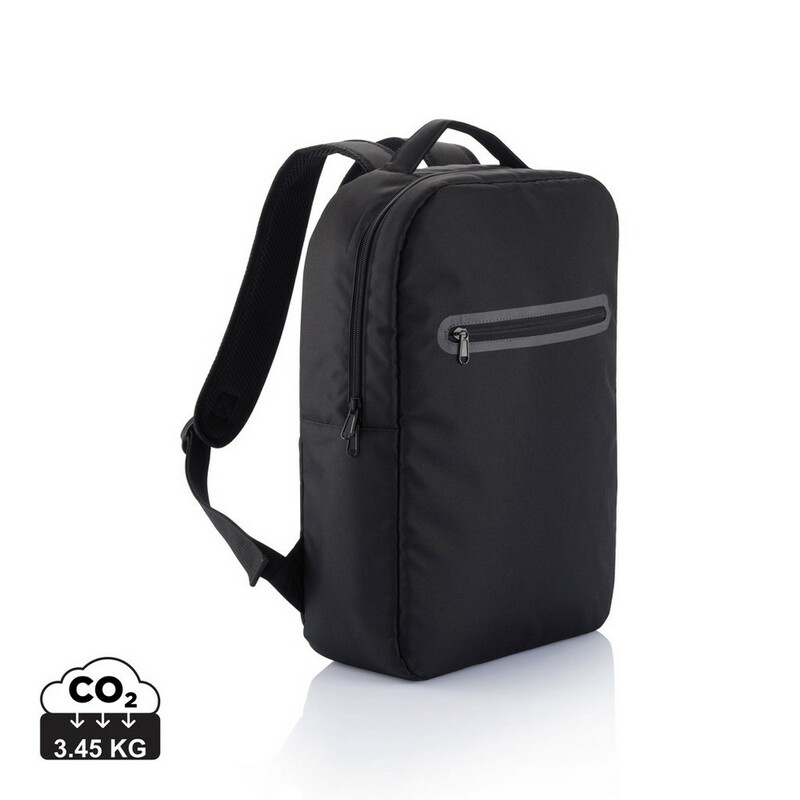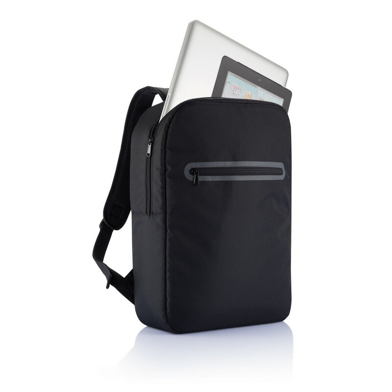 Plecak na laptopa 15,6", wykonany z poliestru 300D, 1 przegroda główna z kieszenią na tablet oraz organizer, nie zawiera PVC, ślad węglowy produktu: 3,45 kg CO2