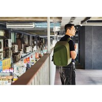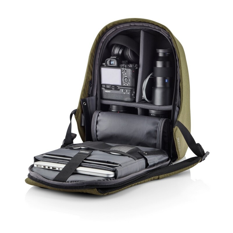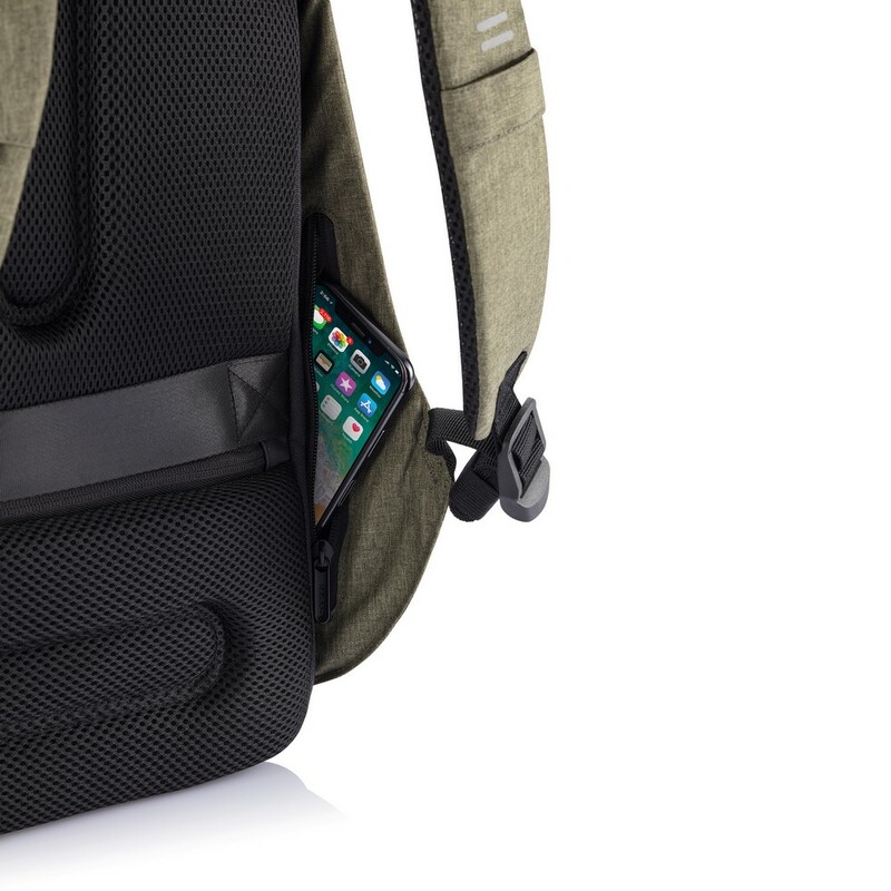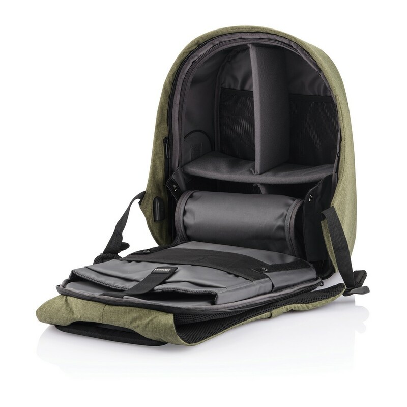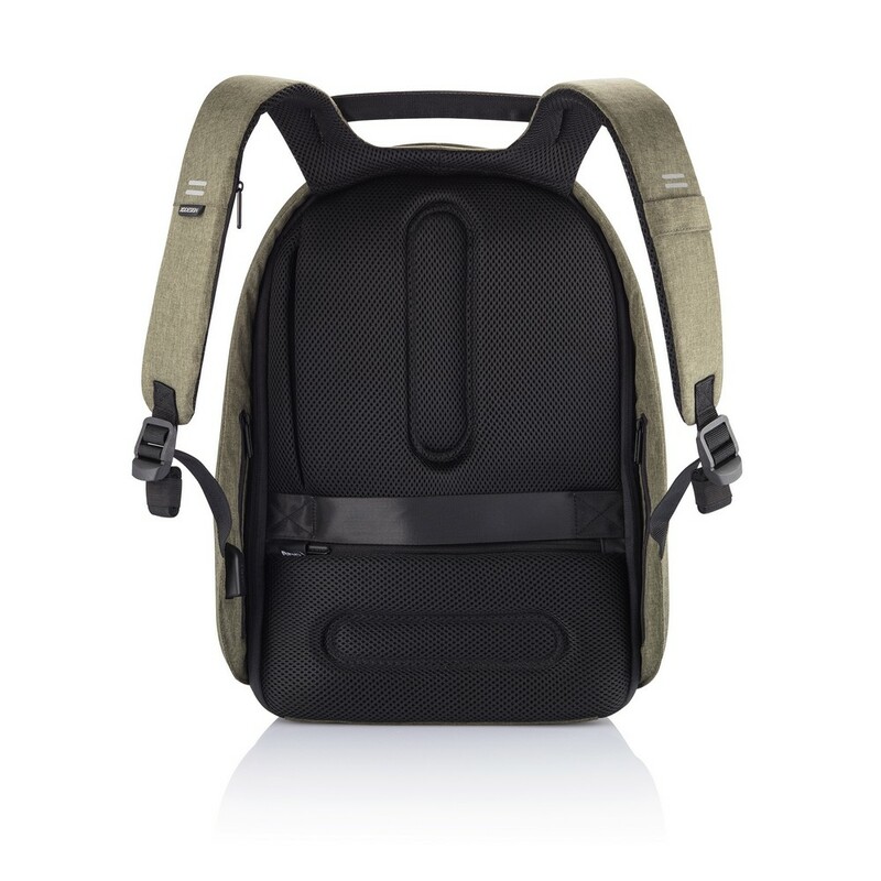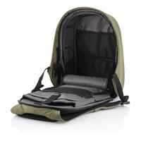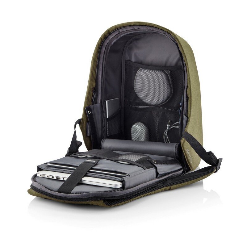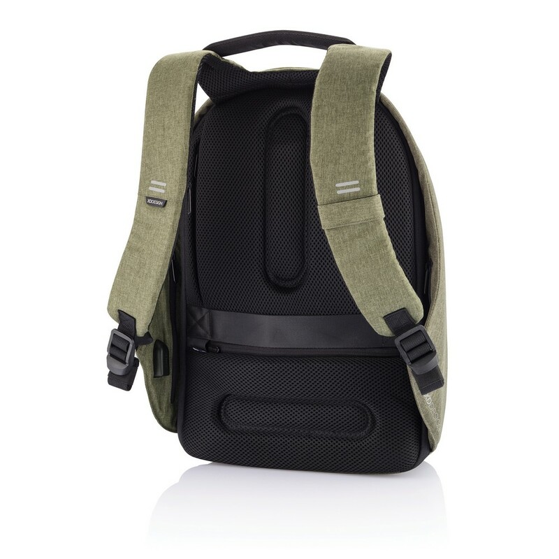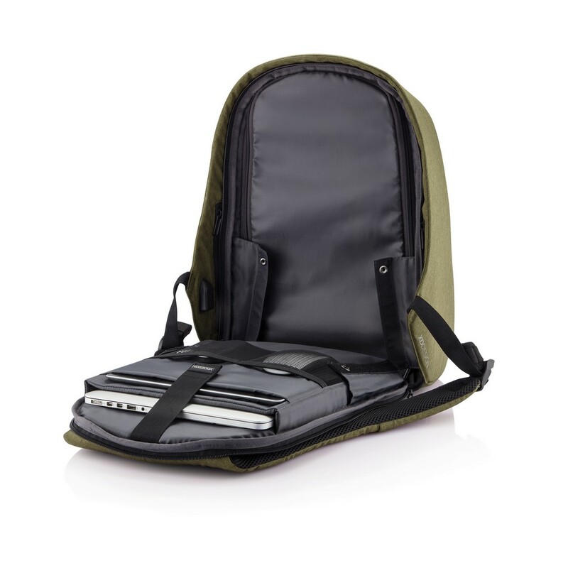 Plecak chroniący przed kieszonkowcami Bobby Hero Regular, wodoodporny i odporny na przecięcia materiał, wykonany z materiału RPET, ukryte zamki i kieszenie, wewnątrz miękkie przegrody na laptopa 15,6" i tablet do 12,9", zintegrowany port USB do ładowania telefonów (power-bank nie jest dołączony), odblaskowe paski zwiększające widoczność, pasek do zamocowania na walizce, wzór zastrzeżony®, ślad węglowy produktu: 6,68 kg CO2