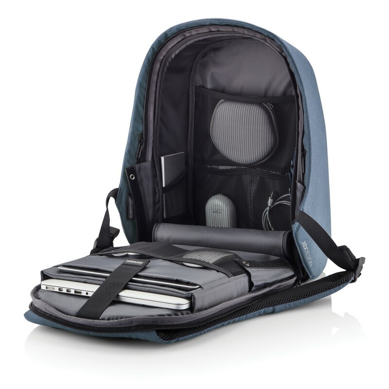 Plecak chroniący przed kieszonkowcami Bobby Hero Small, wodoodporny i odporny na przecięcia materiał, wykonany z przyjaznego środowisku materiału RPET, ukryte zamki i kieszenie, wewnątrz miękkie przegrody na laptopa do 13,3" i tablet do 12,9", zintegrowany port USB do ładowania telefonów (power-bank nie jest dołączony), odblaskowe paski zwiększające widoczność, pasek do zamocowania na walizce, wzór zastrzeżony®, ślad węglowy produktu: 6,28 kg CO2