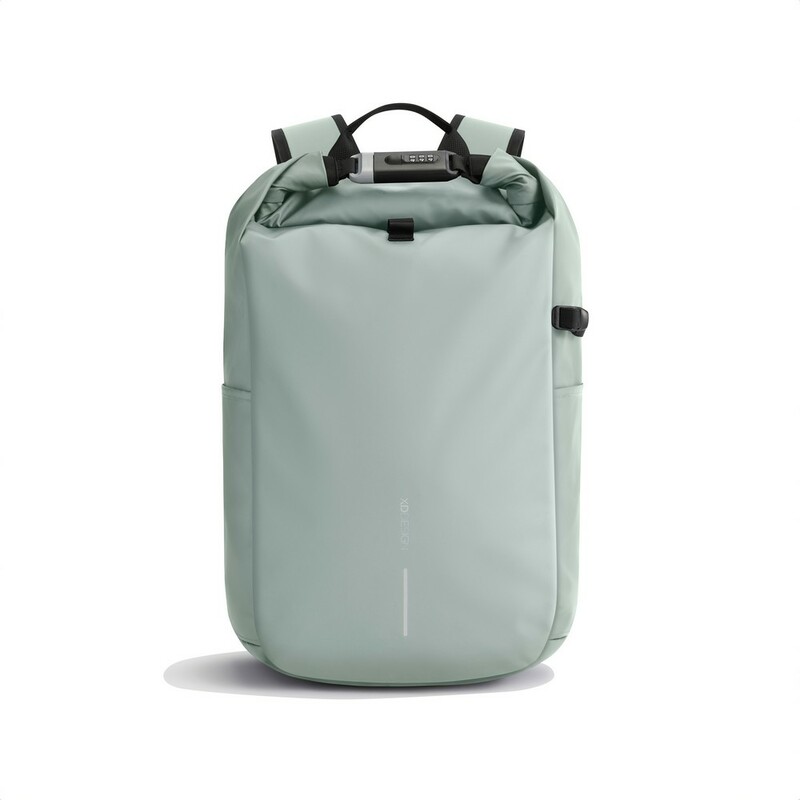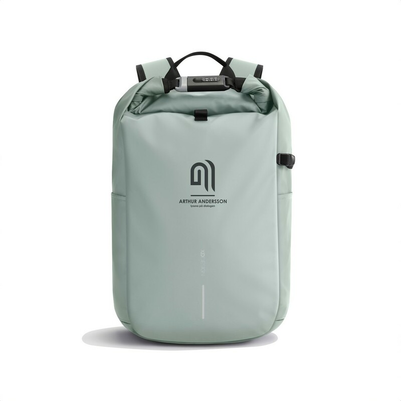 Plecak chroniący przed kieszonkowcami, zwijana przegroda główna i zamek szyfrowy wzmocniony stalą umożliwiający całkowite zamknięcie plecaka, zamek może posłużyć również do przypięcia plecaka do stałego obiektu, ukryte kieszenie do przechowywania dokumentów i kart kredytowych z tyłu torby oraz w pasku na ramię z ochroną RFID, kieszeń boczna, odpinana elastyczna siatka na sprzęt sportowy w komplecie, wewnątrz usztywnione przegrody na laptopa 16" lub tablet, siateczkowe kieszenie na inne przedmioty osobiste, całkowita zawartość materiałów z recyklingu obliczona w oparciu o wagę całkowitą przedmiotu: 11%, wzór zastrzeżony®