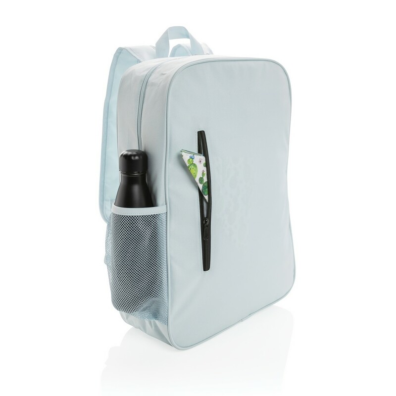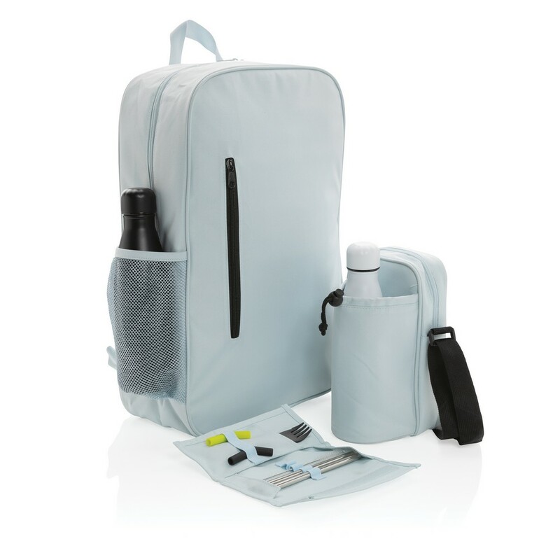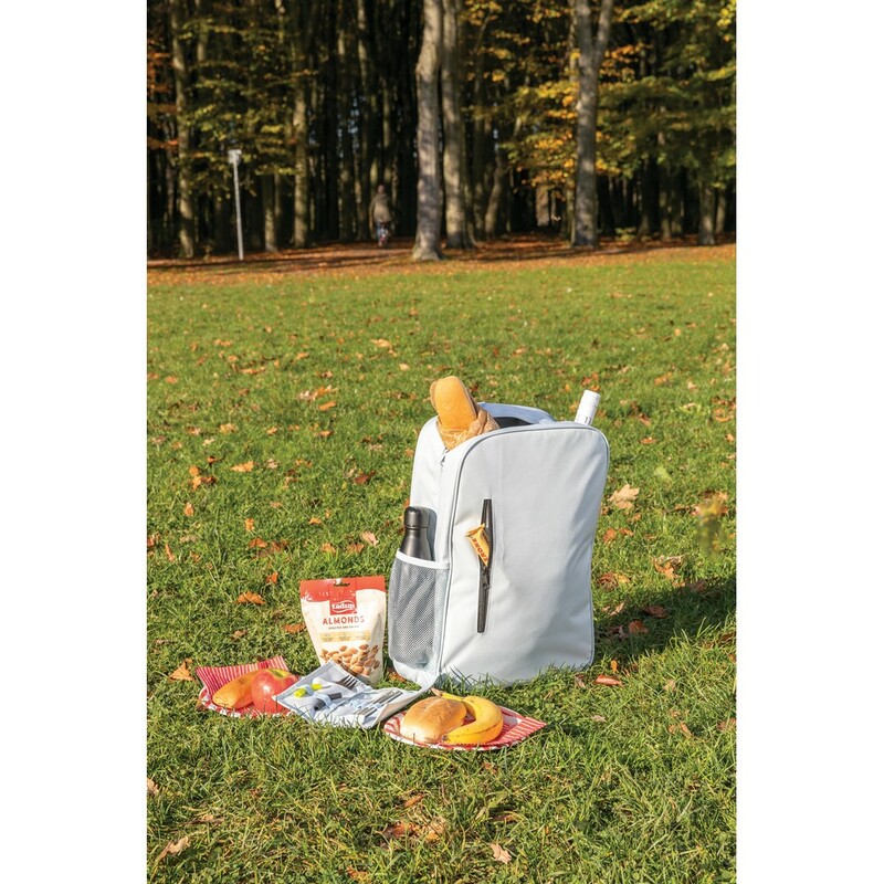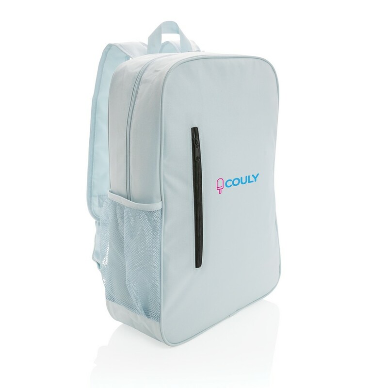 Plecak termoizolacyjny, pojemność do 12 puszek 0,33l lub do 8 puszek i 2 butelek 1l, z przodu kieszenie na zamek, wnętrze z poliestru 210D i PEVA, na zewnątrz poliester 600D, na zawiera PVC, ślad węglowy produktu: 3,04 kg CO2