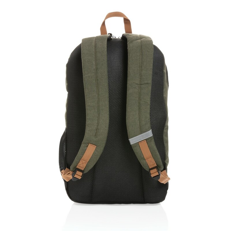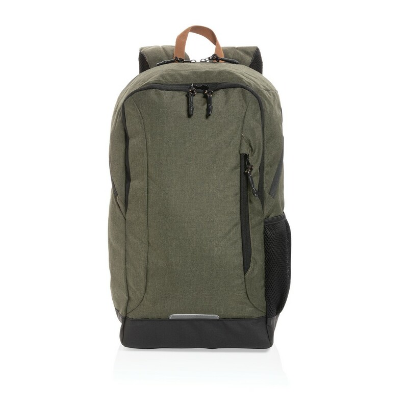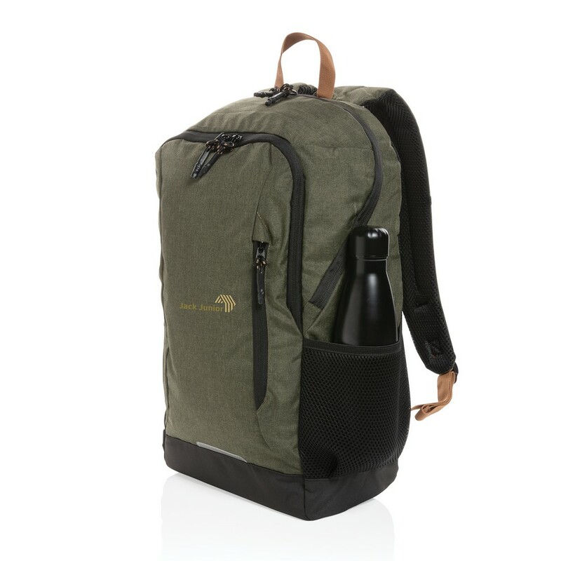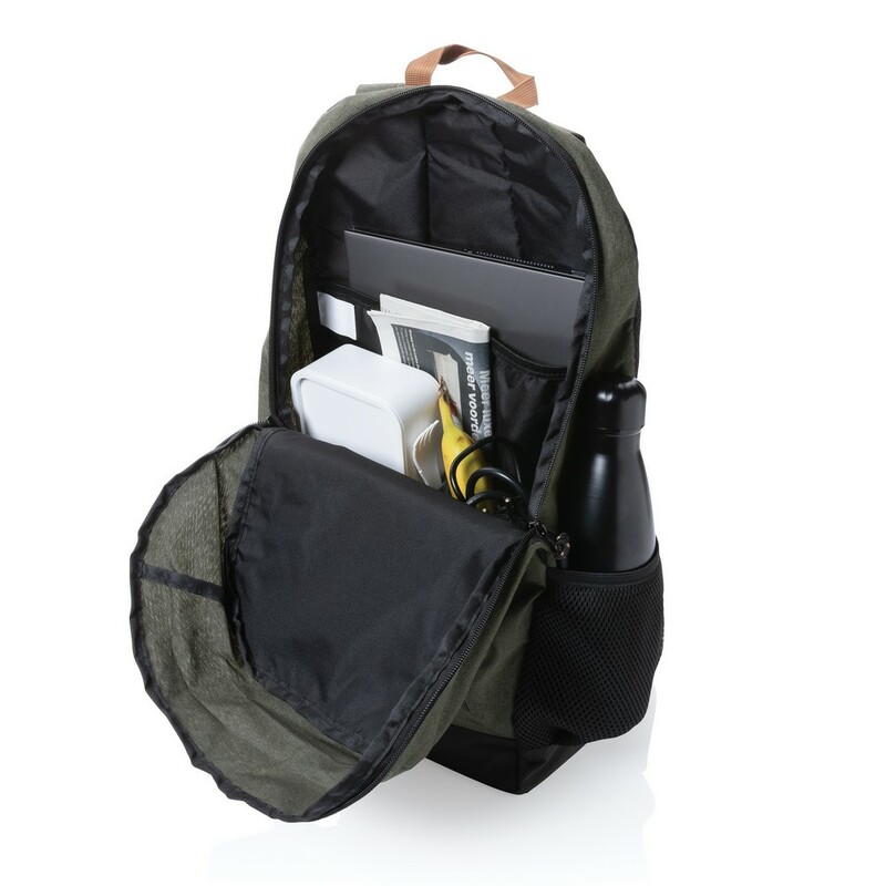 Plecak, przestronna przegroda główna, wewnątrz mniejsza, z przodu kieszeń na zamek na drobne akcesoria, wykonany z poliestrów pochodzących z recyklingu do produkcji których zostało ponownie wykorzystanych 16,65 butelek PET o pojemności 0,5 l, dzięki zastosowaniu technologii śledzącej AWARE™ wykorzystane włókna są identyfikowalne z pochodzenia, 2% wpływów z każdego sprzedanego produktu jest przekazywane na rzecz Water.org