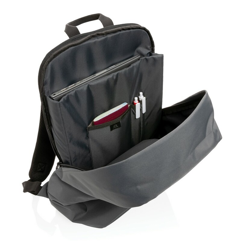 Plecak na laptopa 15,6" chroniący przed kieszonkowcami, przestronna przegroda główna, wewnątrz kieszeń z ochroną RFID, pasek do zamocowania na walizce, wykonany z poliestrów pochodzących z recyklingu do produkcji których zostało ponownie wykorzystanych 19,9 butelek PET o pojemności 0,5 l, dzięki zastosowaniu technologii śledzącej AWARE™ wykorzystane włókna są identyfikowalne z pochodzenia, 2% wpływów z każdego sprzedanego produktu jest przekazywane na rzecz Water.org