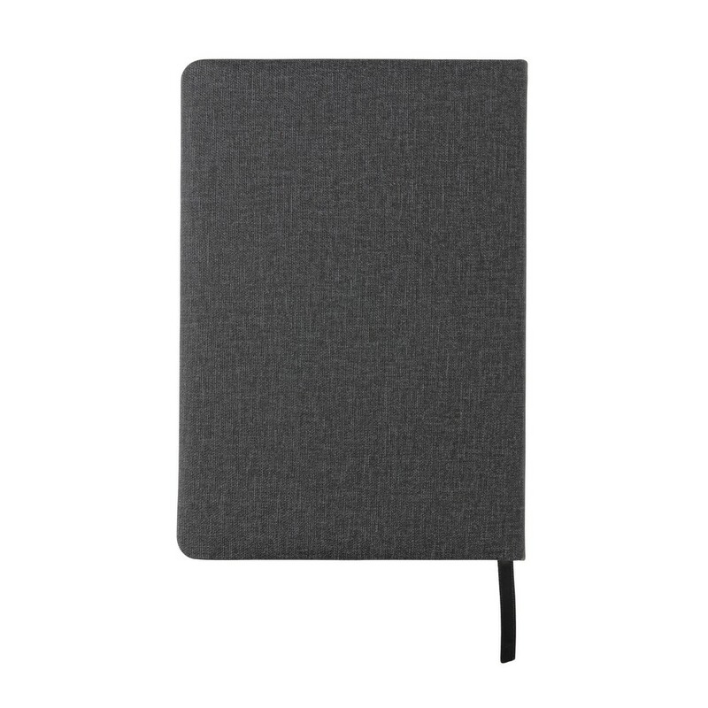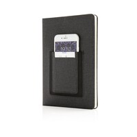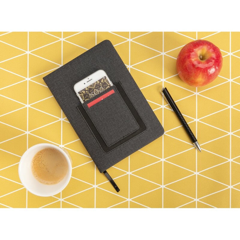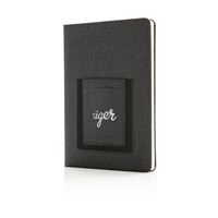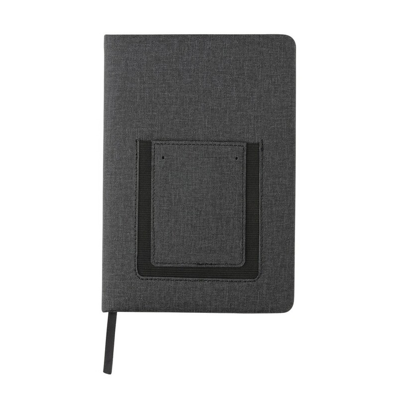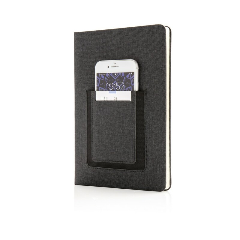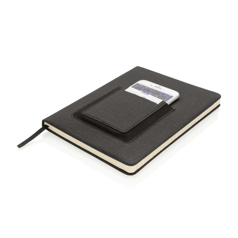 Notatnik A5 (80 kremowych kartek 78 g/m2), posiada kieszeń na telefon i miejsce na kartę kredytową, tasiemka zakładkowa, ślad węglowy produktu: 0,67 kg CO2