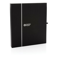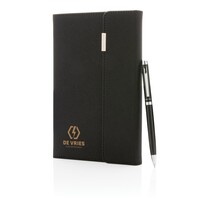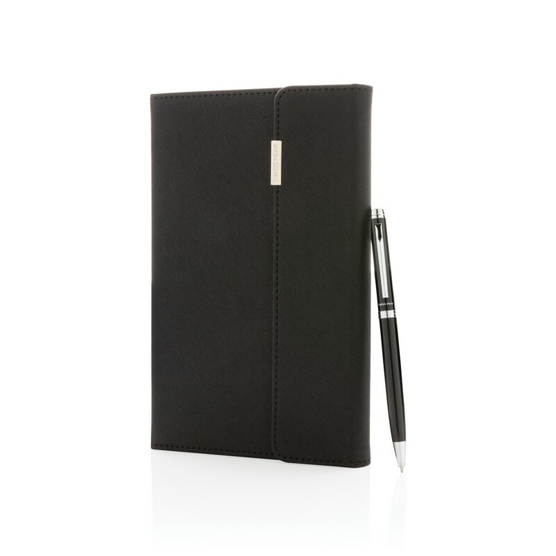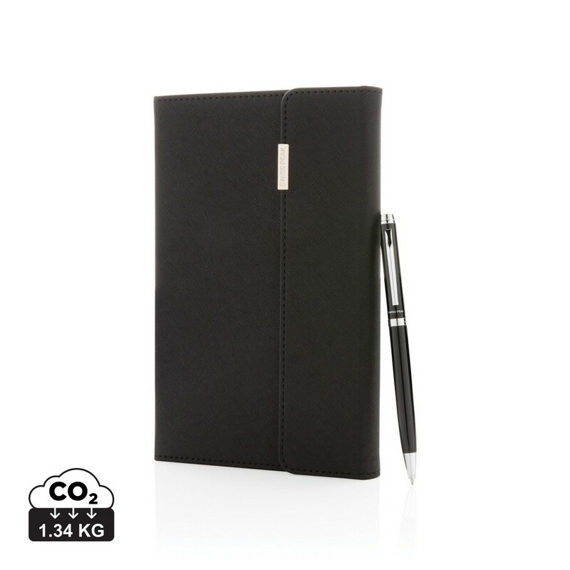 Luksusowy notatnik A5 (80 kremowych kartek 80 g/m2 w linie), okładka wykonana z PU z metalowym logo, długopis z niemieckim wkładem w komplecie, długość pisania ok. 1200 m, w ozdobnym pudełku, ślad węglowy produktu: 1,34 kg CO2