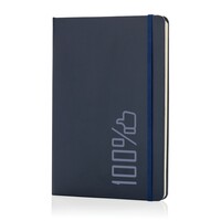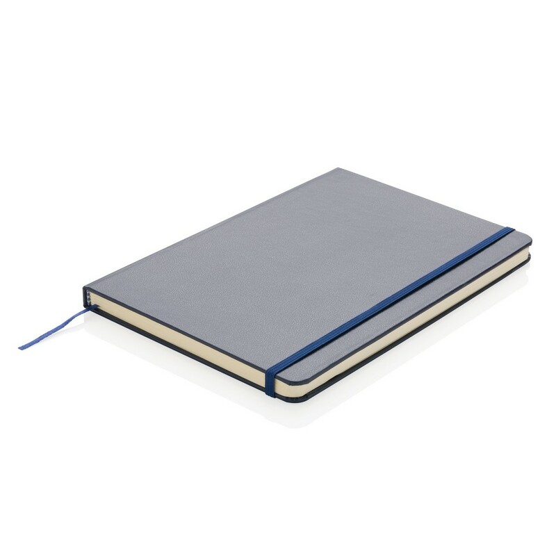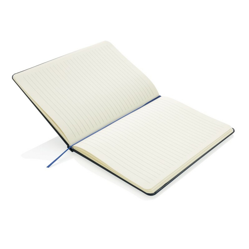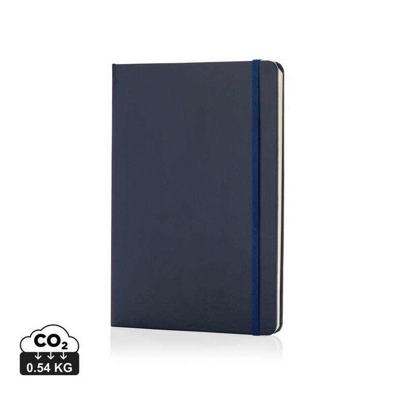 Notatnik A5 (72 kremowe kartki 70 g/m2 w linie), twarda okładka, tasiemka zakładkowa i elastyczna opaska do zamykania, ślad węglowy produktu: 0,54 kg CO2