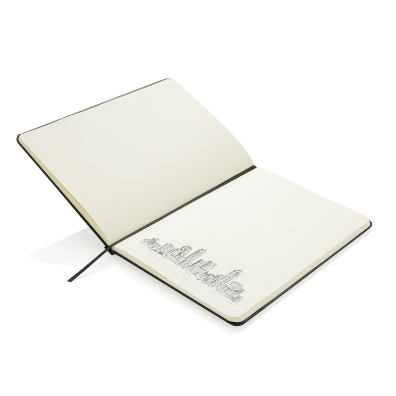 Notatnik A5 (72 puste kartki 70 g/m2 w kolorze kremowym), szkicownik, twarda okładka, tasiemka zakładkowa oraz elastyczna opaska do zamykania, ślad węglowy produktu: 0,54 kg CO2