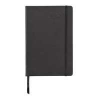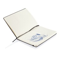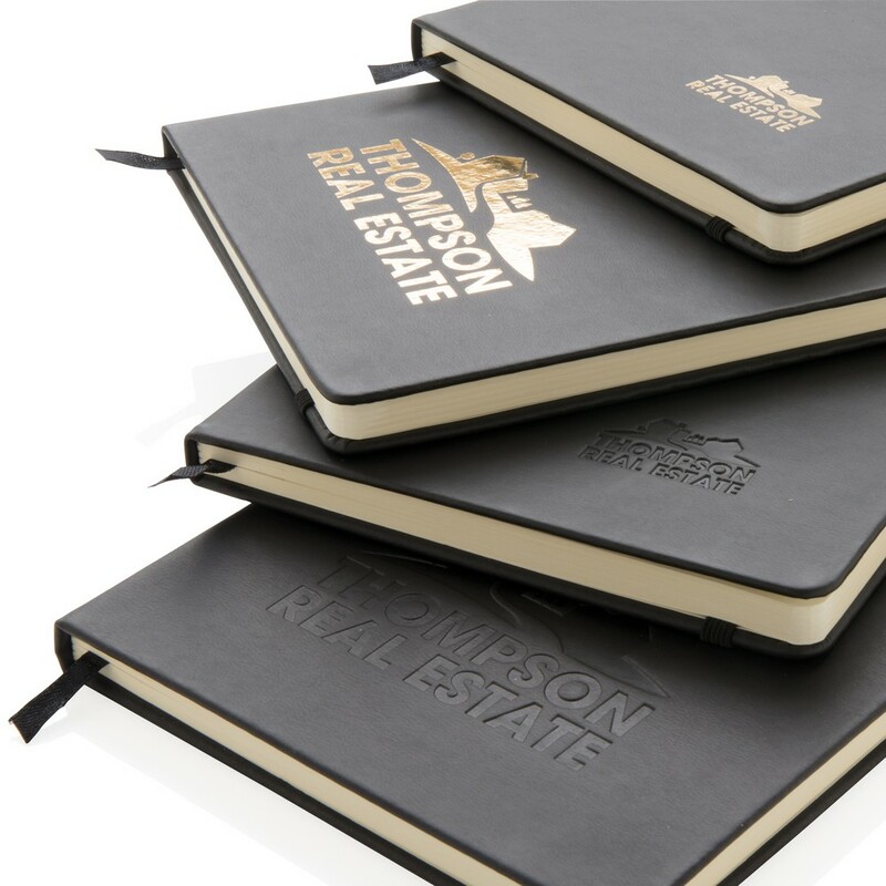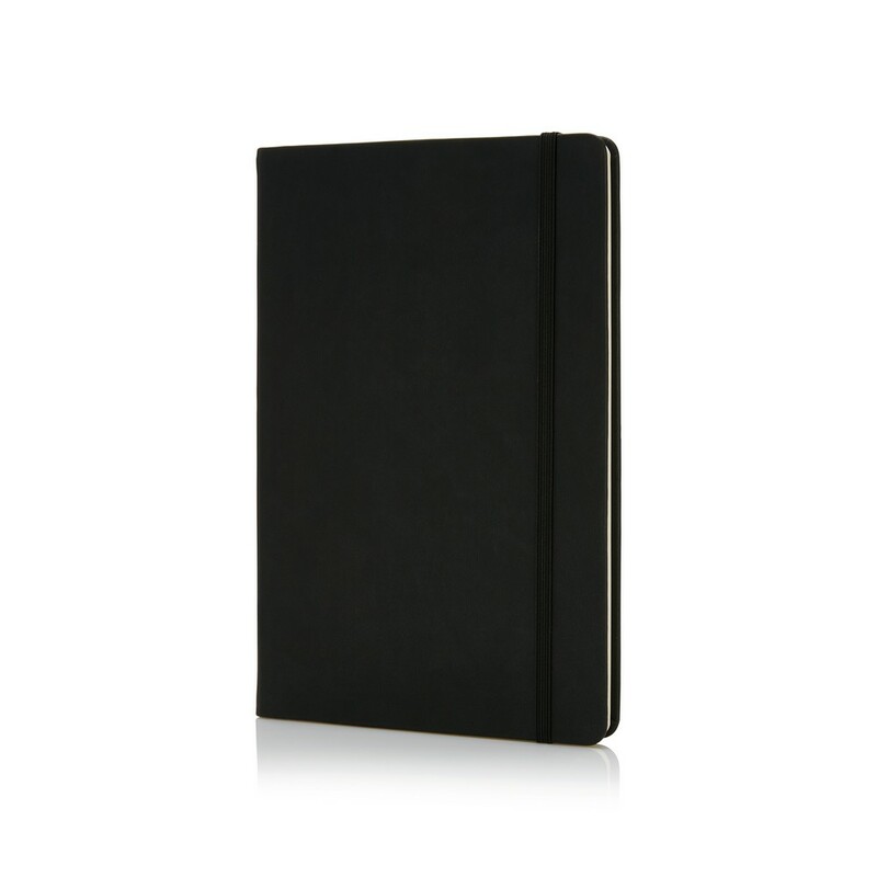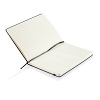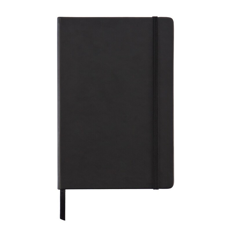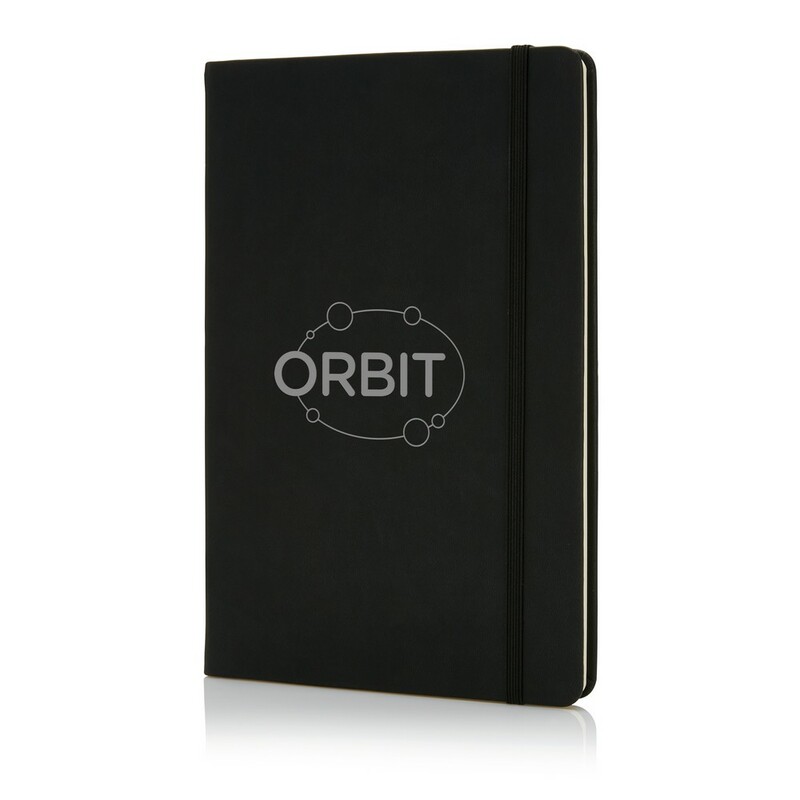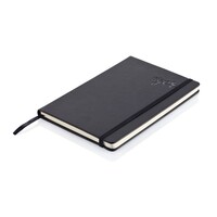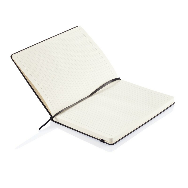 Notatnik A5 (80 kartek 80 g/m2 w linie), twarda okładka z PU doskonale nadaje się do tłoczenia, tasiemka zakładkowa i elastyczna opaska do zamykania, ślad węglowy produktu: 0,67 kg CO2