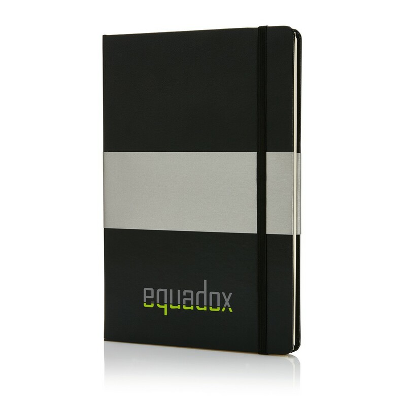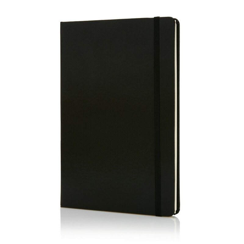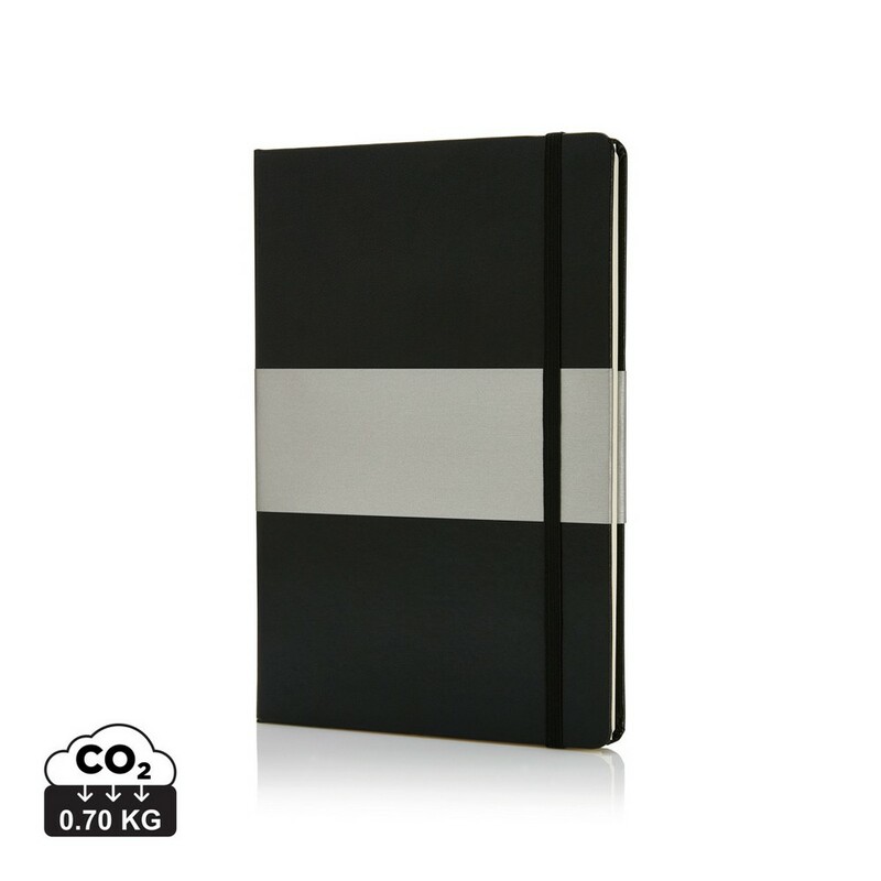 Notatnik A5 (80 kremowych kartek 80 g/m2 w linie), twarda okładka, tasiemka zakładkowa, elastyczna opaska do zamykania, obwoluta, zaokrąglone rogi, ślad węglowy produktu: 0,7 kg CO2