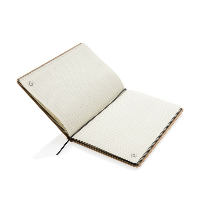 Notatnik A5 (72 kremowe kartki 70 g/m2 w linie), wykonany z papieru makulaturowego, tasiemka zakładkowa i elastyczna opaska do zamykania, ślad węglowy produktu: 0,52 kg CO2