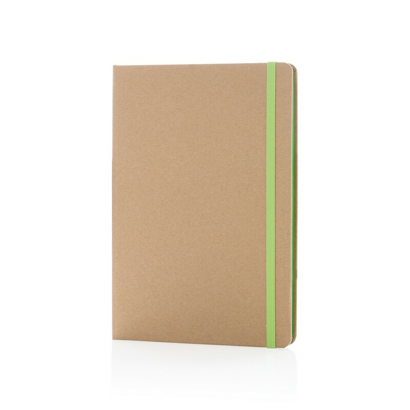 Notatnik A5 (72 kremowe kartki 70 g/m2 w linie), wykonany z papieru makulaturowego, tasiemka zakładkowa i elastyczna opaska do zamykania, ślad węglowy produktu: 0,52 kg CO2