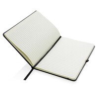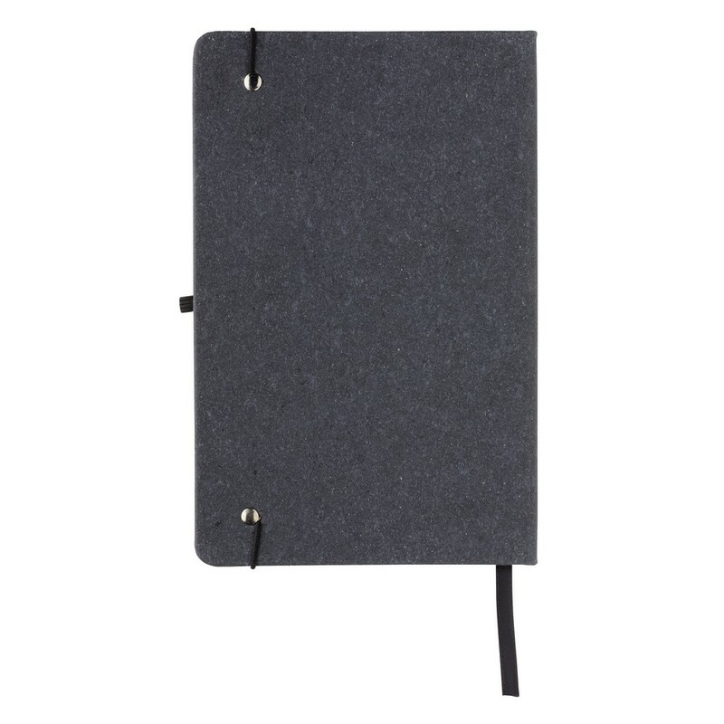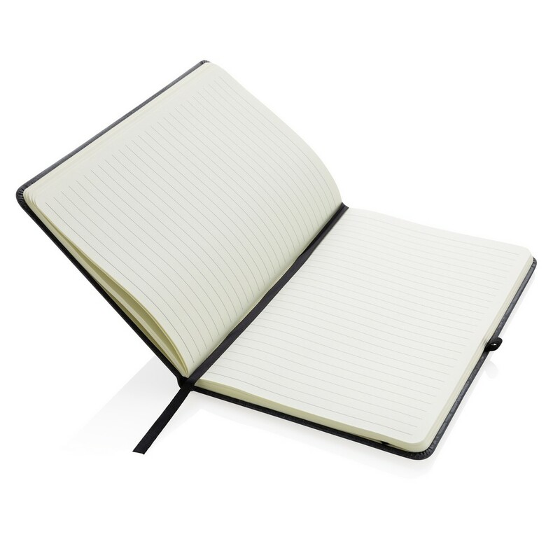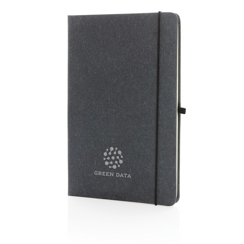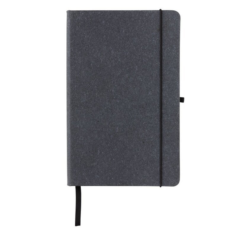 Notatnik A5 (80 białych kartek 70 g/m2 w linie), elastyczna opaska do zamykania, miejsce na przybory do pisania, okładka wykonana ze skóry pochodzącej z recyklingu, ślad węglowy produktu: 0,47 kg CO2