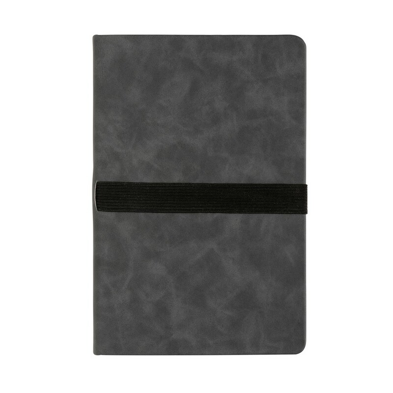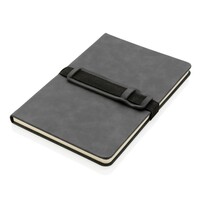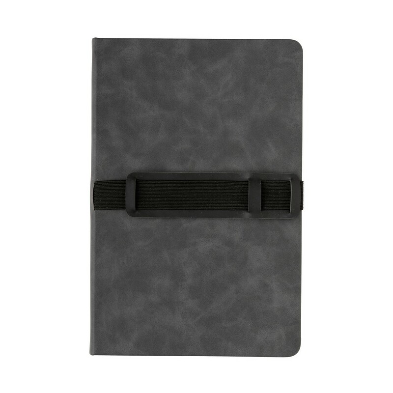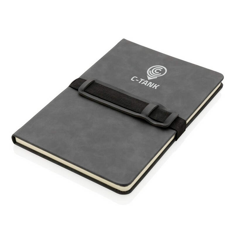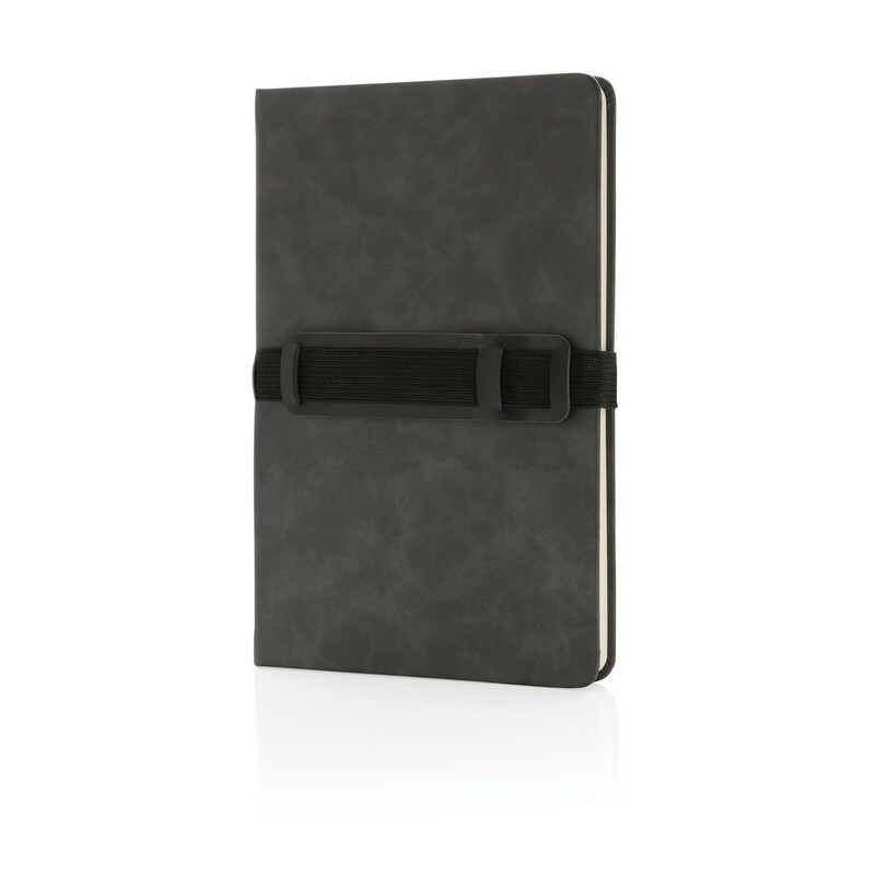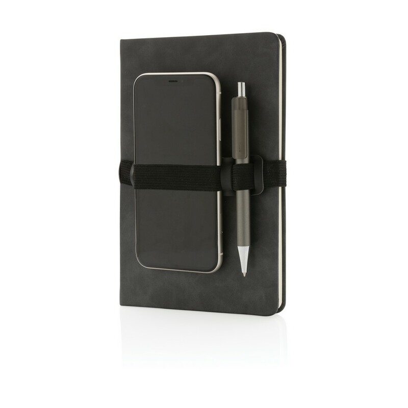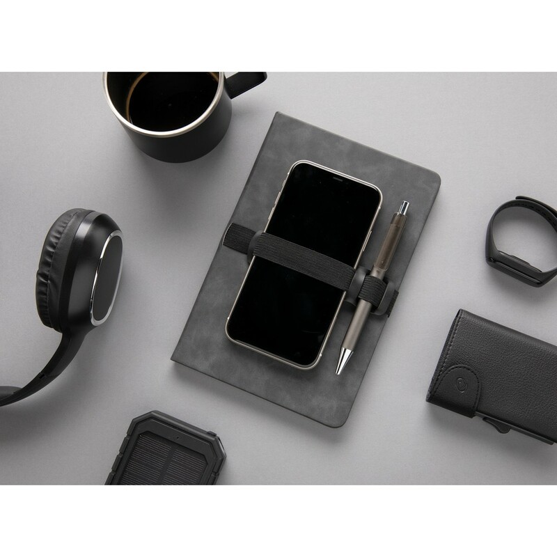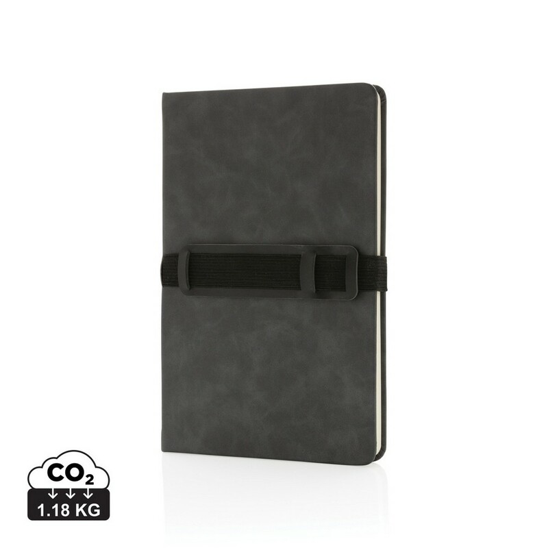 Notatnik A5 (80 kremowych kartek 70 g/m2 w linie), twarda okładka, na okładce specjalna opaska na telefon i długopis, ślad węglowy produktu: 1,18 kg CO2