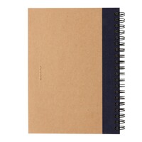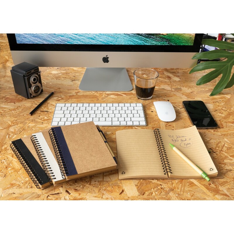 Notatnik (70 kremowych kartek z papieru makulaturowego 70 g/m2 w linie), spiralne bindowanie, dopasowany kolorystycznie długopis z papieru kraftowego w komplecie, niemiecki wkład Dokumental® w kolorze niebieskim w komplecie, długość pisania ok. 600 m, ślad węglowy produktu: 0,33 kg CO2