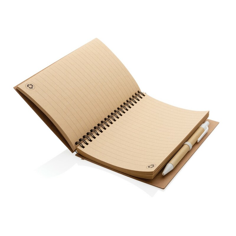 Notatnik (70 kremowych kartek z papieru makulaturowego 70 g/m2 w linie), korkowa okładka, spiralne bindowanie, dopasowany kolorystycznie długopis z papieru kraftowego w komplecie, niemiecki wkład Dokumental® w kolorze niebieskim w komplecie, długość pisania ok. 600 m, ślad węglowy produktu: 0,34 kg CO2