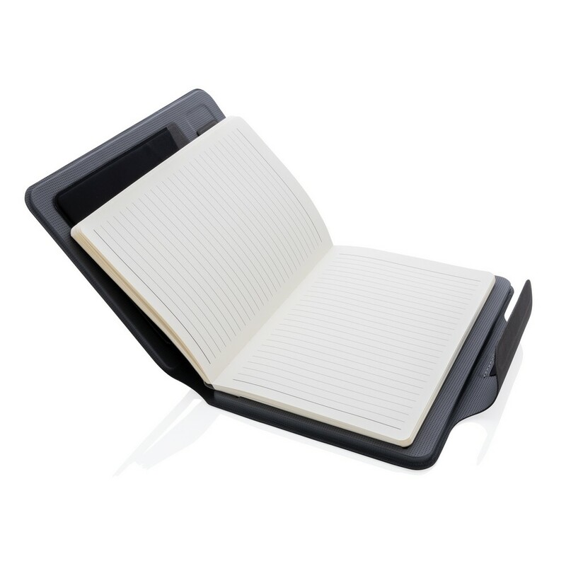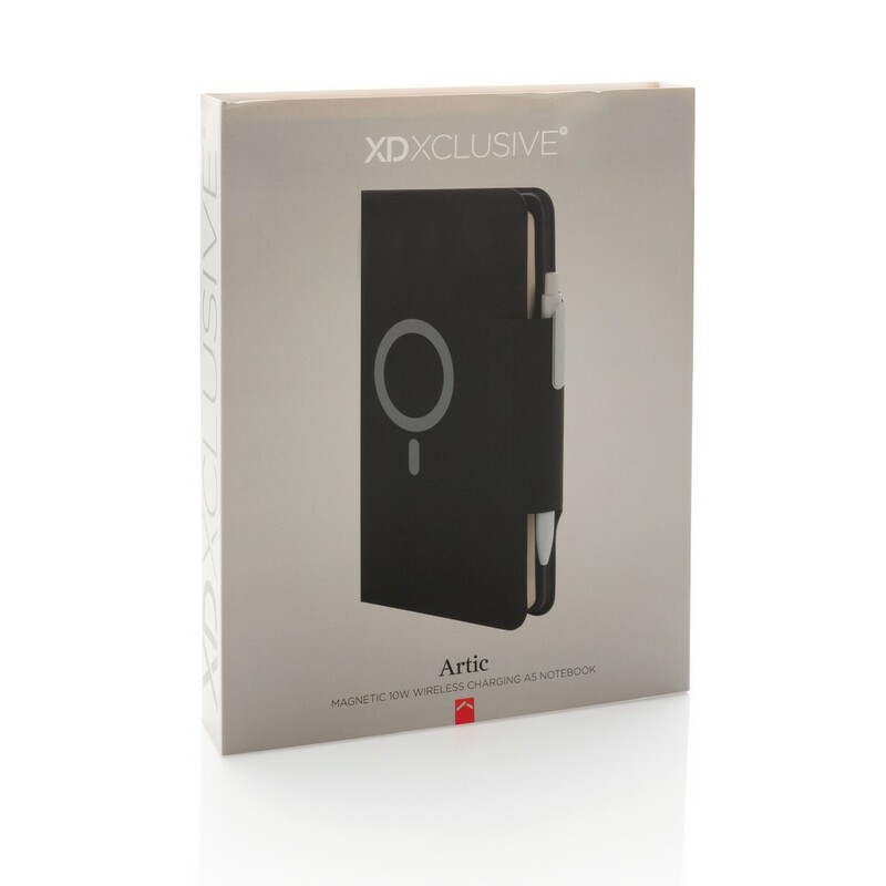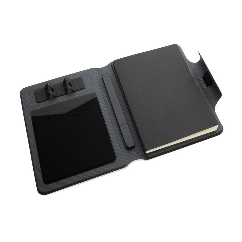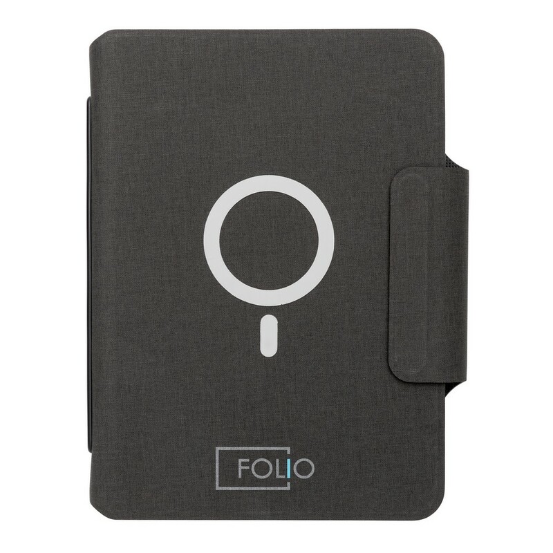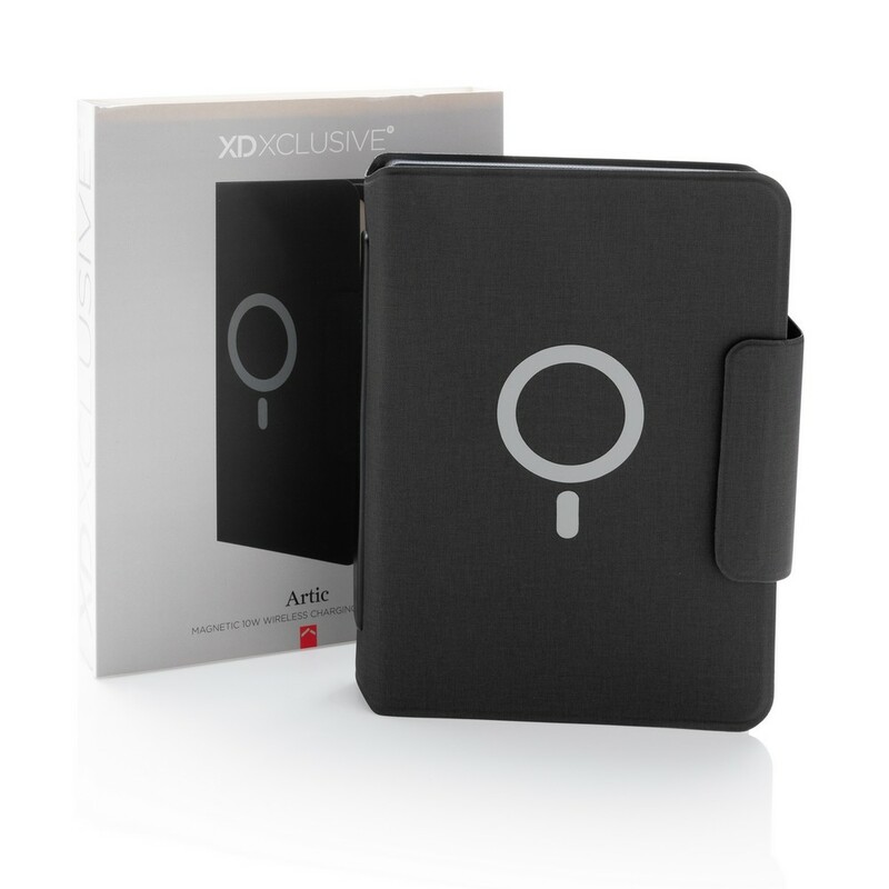 Teczka konferencyjna z notatnikiem A5 (64 kartki 80 g/m2 w linie), bezprzewodowy power bank 8000 mAh, magnetyczna ładowarka bezprzewodowa 10W, 19 wbudowanych magnesów N52H, posiada port USB do ładowania za pomocą kabla, bezprzewodowe ładowanie jest kompatybilne ze wszystkimi urządzeniami posiadającymi możliwość ładowania indukcyjnego, wejście typu C 9V/2A, wyjście typu C 9V/2A, wyjście bezprzewodowe 9V/1.1A, wzór zastrzeżony ®, ślad węglowy produktu: 5,16 kg CO2
