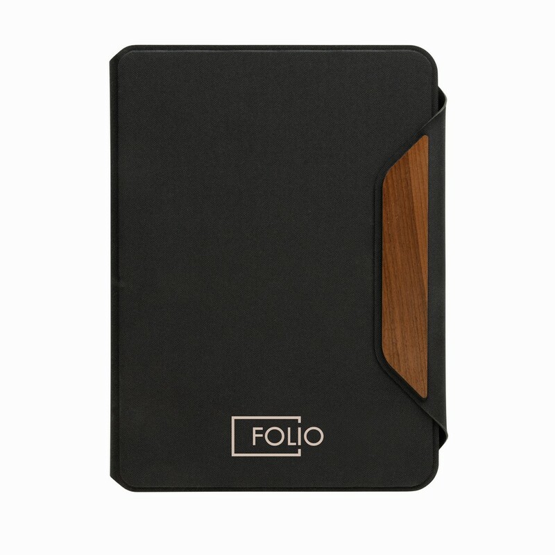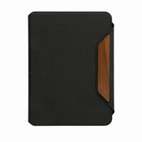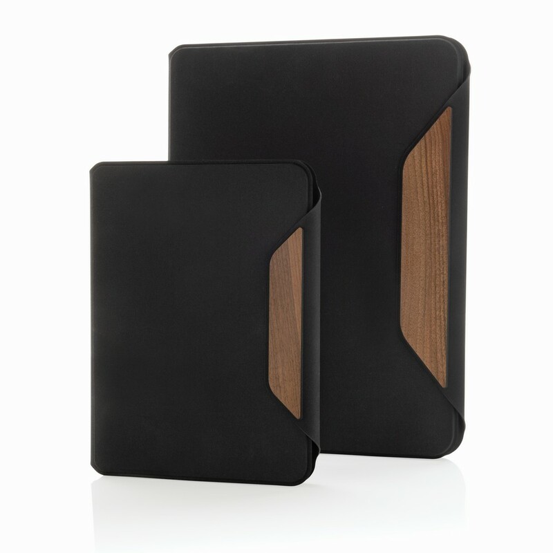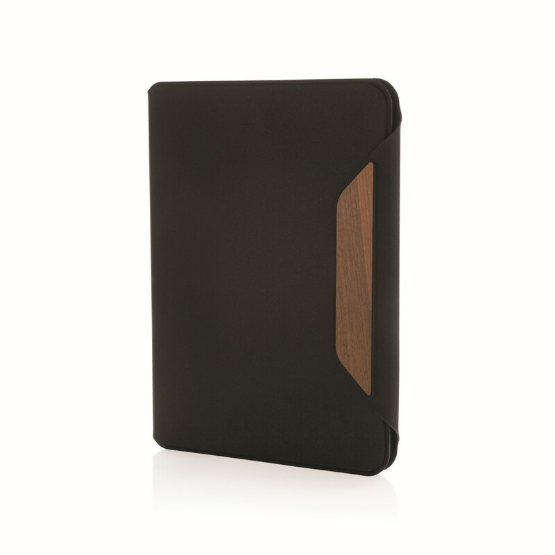 Teczka konferencyjna A5 AWARE™ RPET Teri, wykonana z recyklingowanego poliestru RPET z certyfikatem AWARE™, magnetyczne zamknięcie, emblemat z drewna orzechowego, 2 miejsca na wizytówki, kieszeń na dokumenty A5, notatnik A5 z papieru FSC® mix, 64 kremowe kartki w linie (128 stron), opakowanie prezentowe FSC® mix Fefco 427, bez PVC, 2% dochodu przeznaczone na Water.org