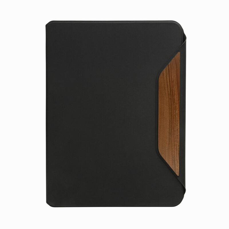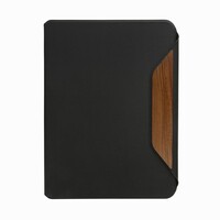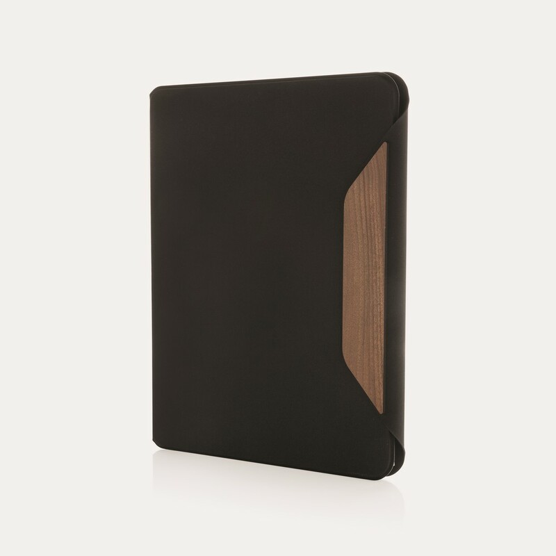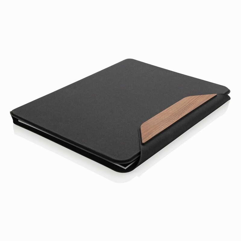 Teczka konferencyjna A4 AWARE™ RPET Teri, wykonana z recyklingowanego poliestru RPET z certyfikatem AWARE™, magnetyczne zamknięcie, emblemat z drewna orzechowego, wewnątrz 4 miejsca na wizytówki, kieszeń na dokumenty A4, notatnik A4 z papieru FSC® mix, 30 kremowych kartek w linie (70 g/m²), opakowanie prezentowe FSC® mix, bez PVC, 2% dochodu przeznaczone na Water.org