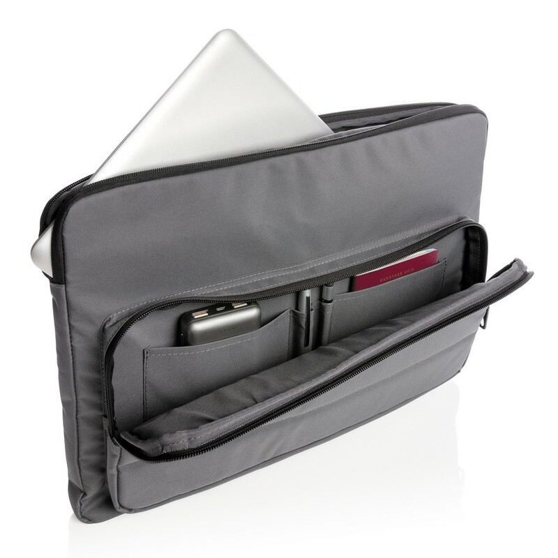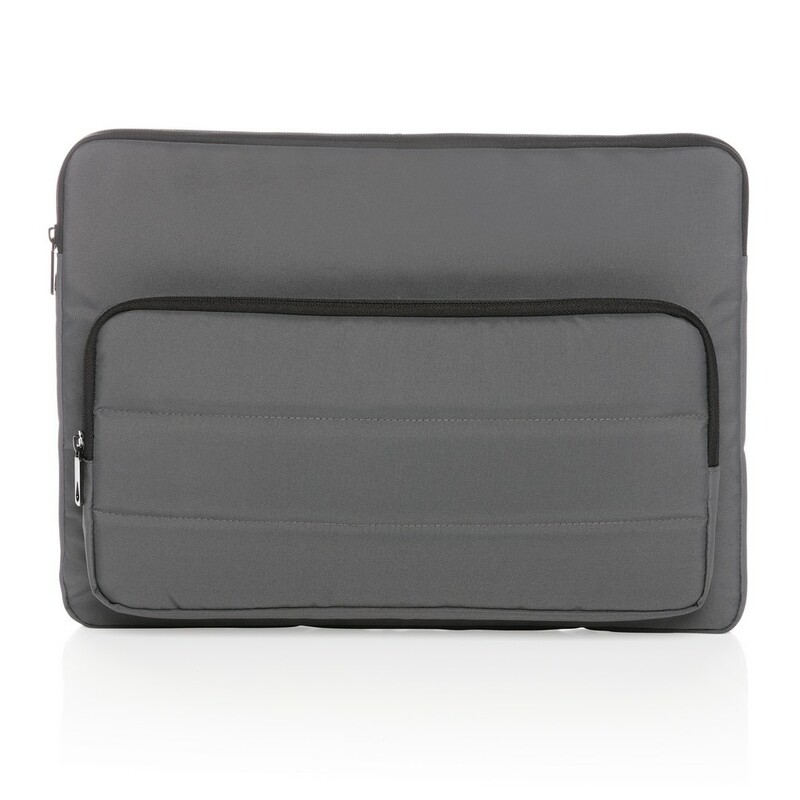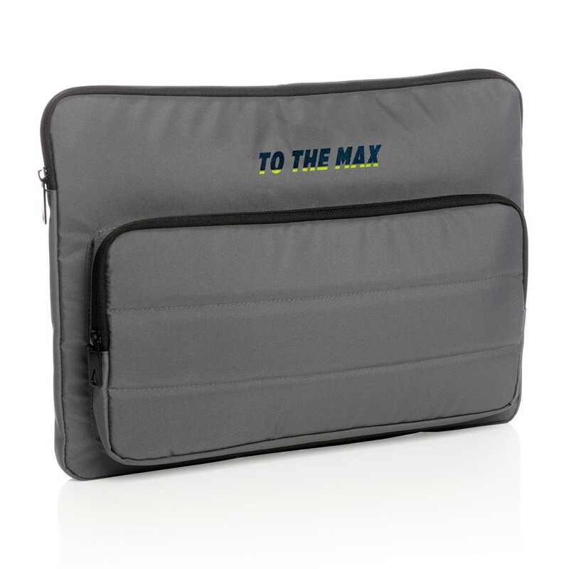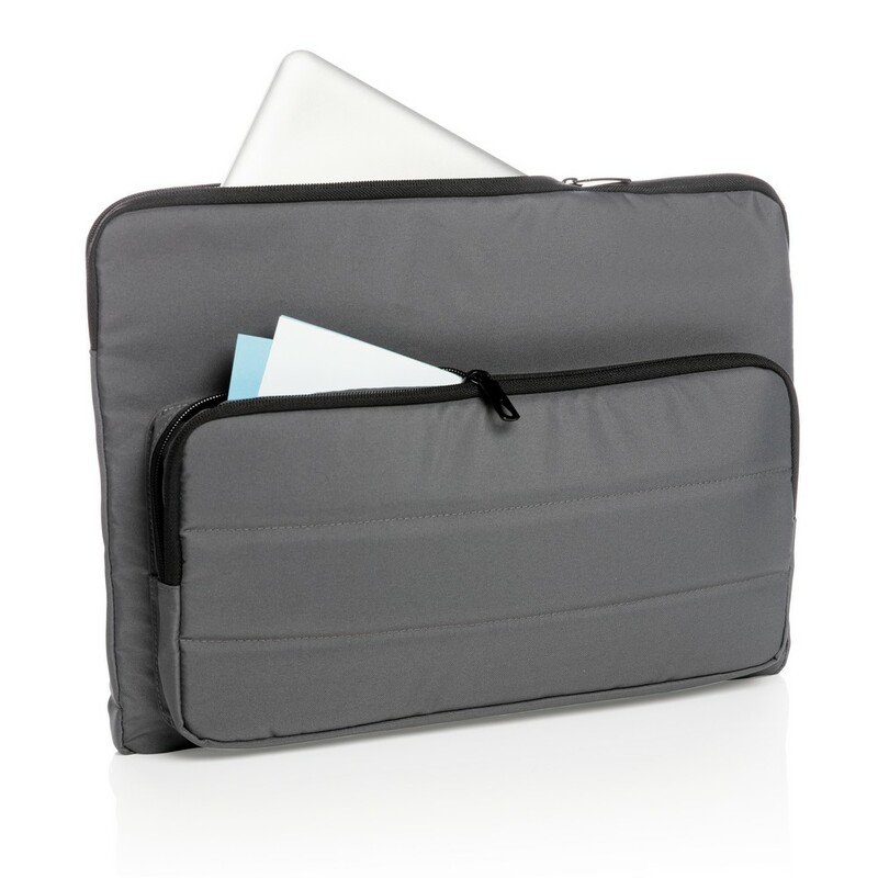 Pokrowiec na laptopa 15,6", w przedniej kieszeni zamykanej na zamek błyskawiczny 2 dodatkowe kieszenie z miejscem na 2 akcesoria piśmiennicze, pokrowca można używać samodzielnie lub umieścić go w torbie lub plecaku, tkanina zewnętrzna i poszewka wewnętrzna wykonane z pochodzącego z poliestru AWARE™ RPET, który został wykonany z butelek PET pochodzących z recyklingu z identyfikowalnym źródłem, produkt został wykonany z 16 butelek plastikowych poddanych recyklingowi, a 2% zysku ze sprzedaży każdego jest przekazywane do fundacji Water.org, nie zawiera PVC
