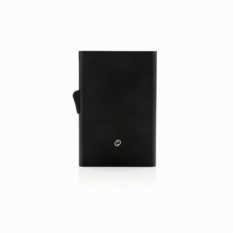 Solidne etui na karty kredytowe C-Secure z ochroną RFID, mieści do 7 kart lub do 5 z tłoczeniem, posiada suwak boczny do wysuwania kart, wykonane z aluminium, ślad węglowy produktu: 0,65 kg CO2