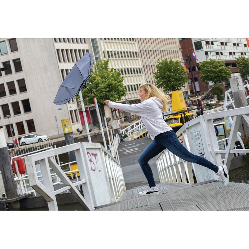 Parasol 21" sztormowy, automatyczne otwieranie i zamykanie, metalowa rama, żebrowanie z włókna szklanego, bambusowy uchwyt, panele wykonane z 7,5 poddanych recyklingowi butelek PET (500 ml), dzięki zastosowaniu technologii fizycznych znaczników AWARE™ wykorzystane materiały są identyfikowalne z pochodzenia, 2% wpływów z każdego sprzedanego produktu z kolekcji Impact jest przekazywane na rzecz Water.org