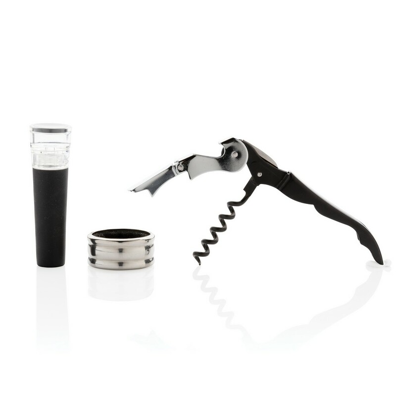 Zestaw akcesoriów do wina 3 el.: korkociąg, nóż do folii, pierścień, w ozdobnym pudełku, ślad węglowy produktu: 0,73 kg CO2