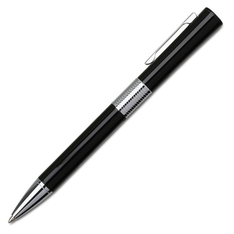 Zestaw składający się z metalowego długopisu i pióra kulkowego zapakowany w eleganckie etui o wypukłej fakturze. Oryginalny kształt klepsydry i połyskująca powierzchnia czynią z tego kompletu doskonały upominek reklamowy. Wkłady w kolorze niebieskim. Obrotowy mechanizm włączania.
