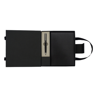 Zestaw składający się z notesu A5 (80 kartek w linie, 80 g/m2) i długopisu z niebieskim wkładem. Zestaw zapakowany w eleganckie pudełko z uchwytami.
