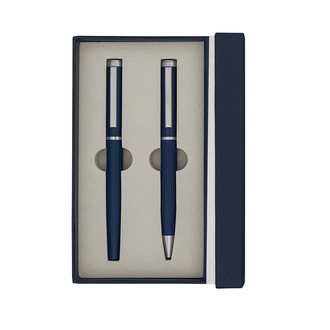 Zestaw składający się z metalowego długopisu i pióra kulkowego. Wkłady w kolorze niebieskim. Zapakowany w eleganckie pudełko.