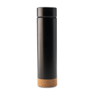 Termos próżniowy o pojemności 450 ml z dwiema metalowymi ściankami, świetnie utrzymujący ciepło, szczelny. Wykonany ze stali nierdzewnej 18/8 o podwyższonej jakości. Urzeka eleganckim połączeniem czerni i korkowej podstawy. Posiada stalowy zaparzacz do herbaty. Utrzymuje temperaturę powyżej 40°C przez 15 godzin.