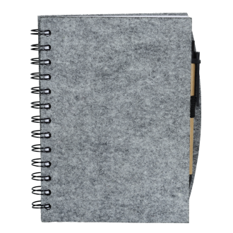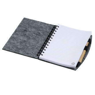 Oprawiony w filc 80-kartkowy notatnik o gramaturze 70 g/m². Wyposażony w długopis wykonany z kartonu z recyklingu z wkładem koloru niebieskiego.