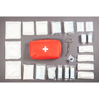 Apteczka samochodowa składająca się 40 elementów. W skład zestawu wchodzą: 1.1 plaster 2,5 cm x 5 m, 2. 4 plastry 10 x 6 cm, 3. 2 plastry 3,8 x 7.2 cm, 4. 2 plastry 12 x 2 cm, 5. 2 plastry 7,2 x 1.9 cm, 6. 4 plastry 7,6 x 2,5 cm, 7. 1 bandaż 6 cm, 8. 2 bandaże 8 cm, 9. 1 bandaż 10 cm, 10. chusta opatrunkowa 40 x 60 cm, 11. chusta opatrunkowa 60 x 80 cm, 12. 4 pary rękawiczek jednorazowych, 13. 2 elastyczne bandaże 5 cm, 14. 3 elastyczne bandaże 8 cm, 15. koc pierwszej pomocy 160 cm x 210 cm, 16. 3 kompresy sterylne, 17. 2 bandaże trójkątne 136 x 96 x 96 cm, 18. nożyczki, 19. 2 chusteczki nawilżane 20 x 10 cm oraz instrukcja. Produkt zgodny z Dyrektywą 93/42/EEC