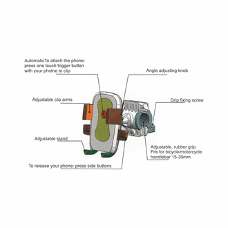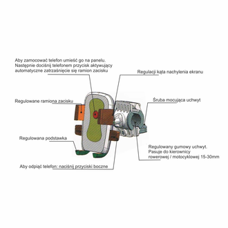 Uchwyt na telefon montowany do kierownicy. Pasuje do telefonów o szerokości 5,5 - 8,5 cm. Regulacja kąta nachylenia. Mechanizm zaciskowy umożliwia mocowanie i zdejmowanie telefonu z uchwytu jedną ręka.