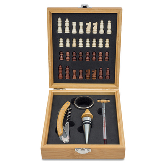 Bambusowy zestaw składający się z szachów i akcesoriów do wina, w skład którego wchodzą: nóż kelnerski, okapnik, zatyczka oraz termometr.